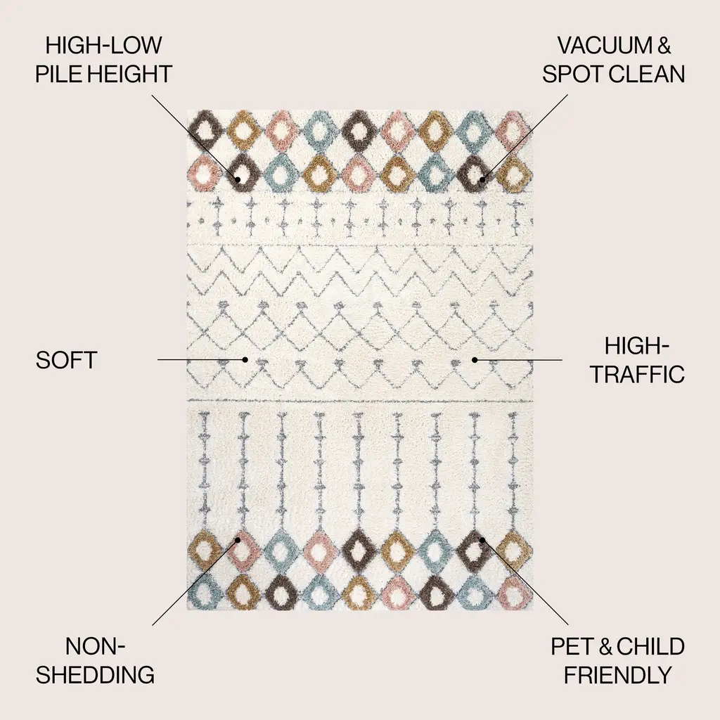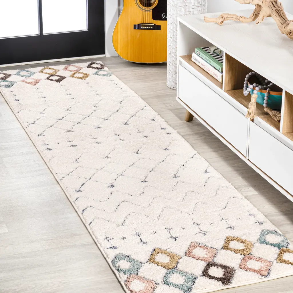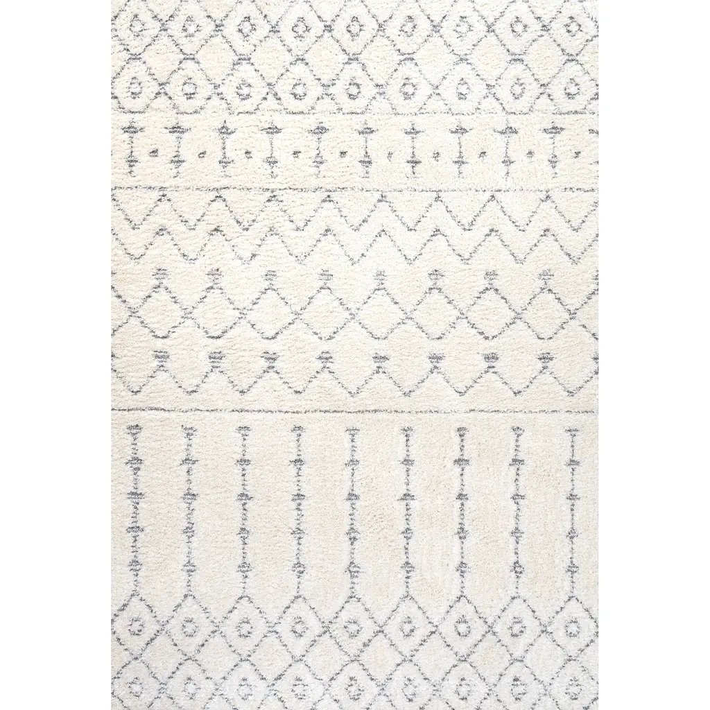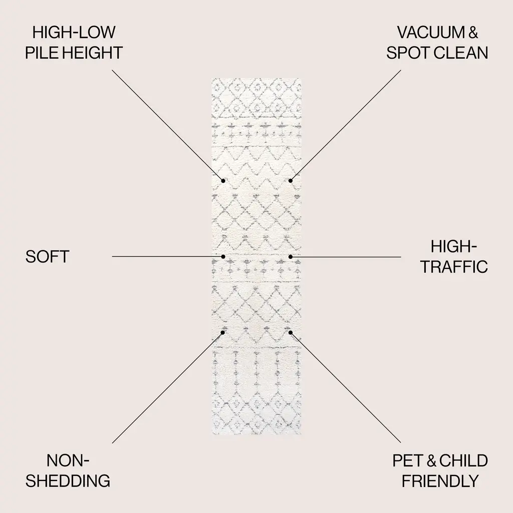 Inspired by vintage Moroccan rugs, this plush trellis rug features tribal elements and geometric diamond borders at each end. Anchor a modern space with the two-tone design, or add Bohemian flair to a bedroom, living room, dining room or home office. This neutral, easy-care rug adds bold pattern and softness to mid-century, transitional and modern interiors.