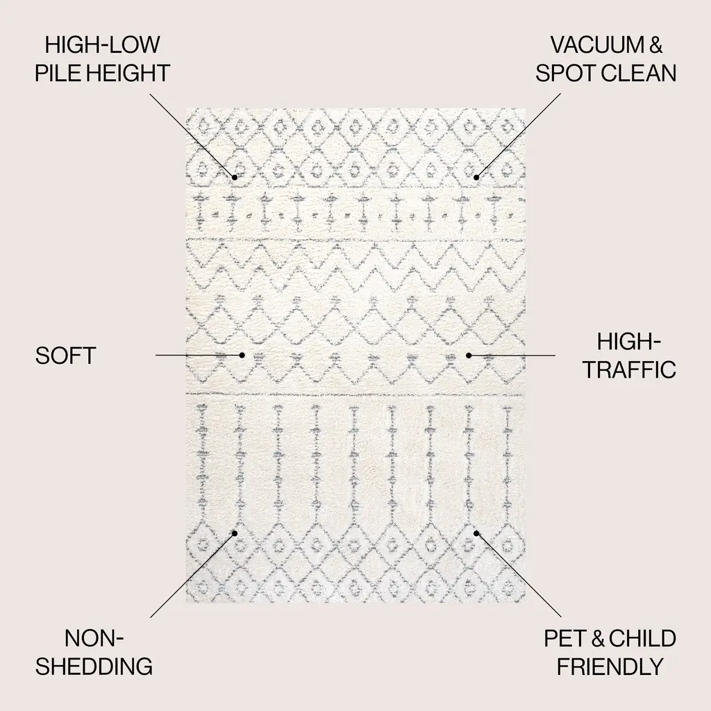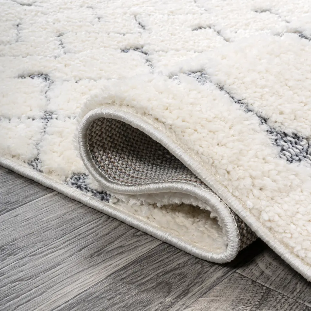 Inspired by vintage Moroccan rugs, this plush trellis rug features tribal elements and geometric diamond borders at each end. Anchor a modern space with the two-tone design, or add Bohemian flair to a bedroom, living room, dining room or home office. This neutral, easy-care rug adds bold pattern and softness to mid-century, transitional and modern interiors.