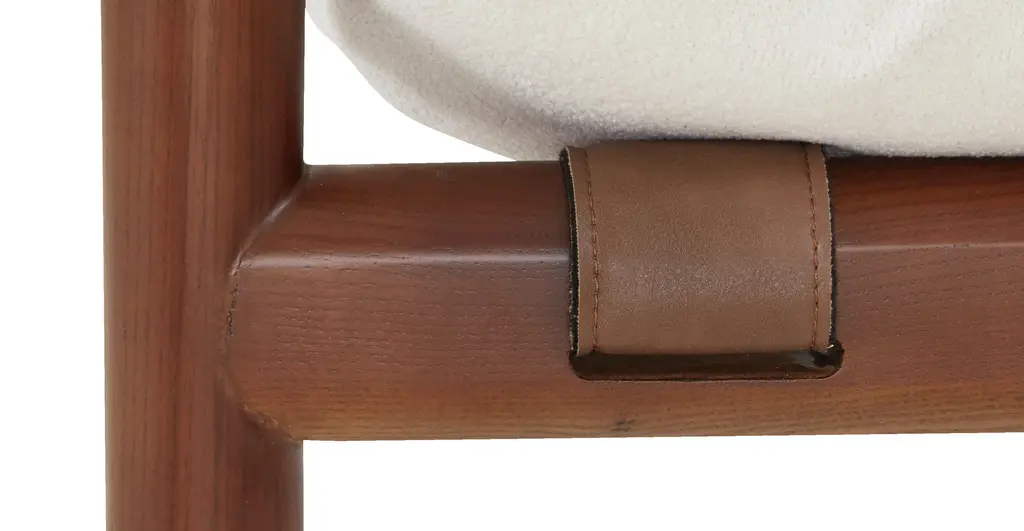 Say hello to your new favorite hangout! With a walnut-finished wood frame and vegan leather straps creating a hammock-style seat, this mid-century lounge chair is all about laid-back luxury. The Polar White performance fabric shrugs off stains like a pro, while the cushy, high-density foam seat is perfect for lounging. Style and comfort? Nailed it!