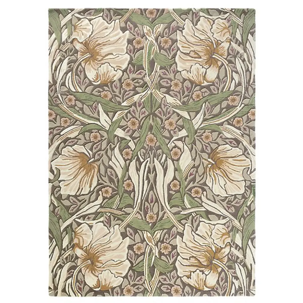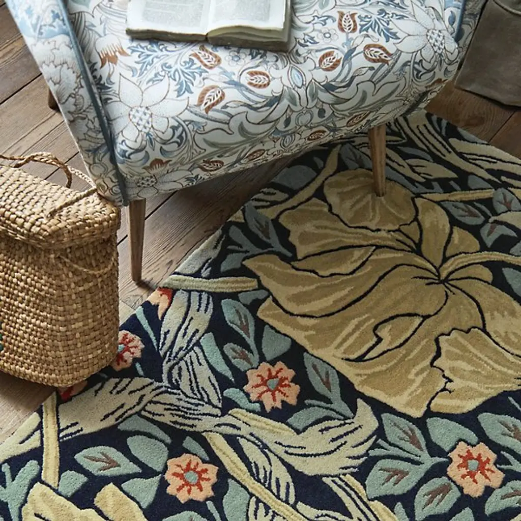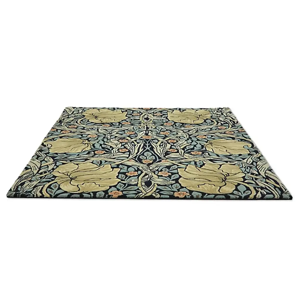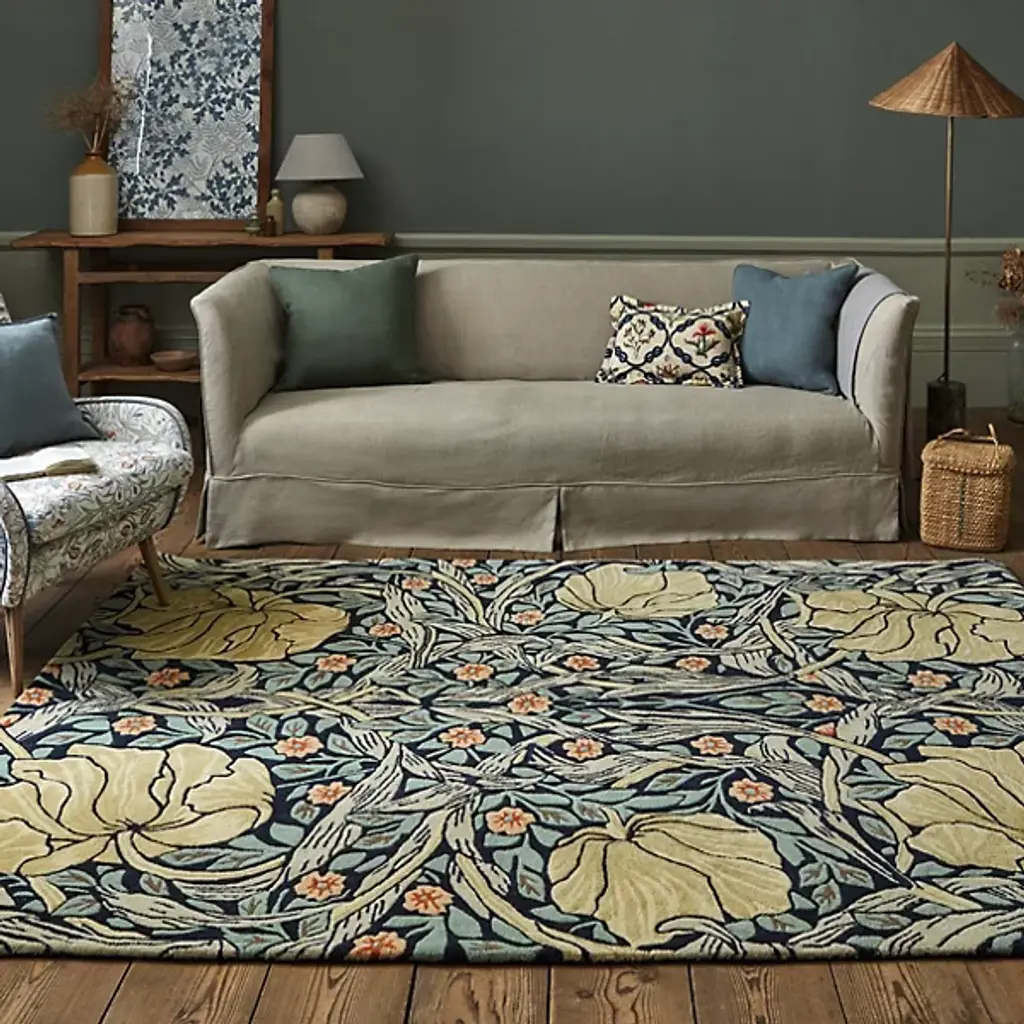 The Pimpernel Area Rug from Morris & Co shows off a swirling vintage pattern created by William Morris. Woven from new wool by Indian artisan hands, each rug is subtly distinct, adding a soft layer of comfort to its surroundings. The swirling vines and graceful blossoms race across its surface, as the rich green leaves contrast well with the pale blossoms, creating a memorable, artistic character.