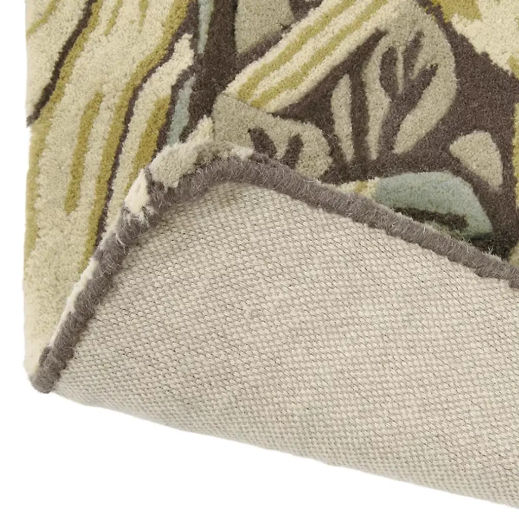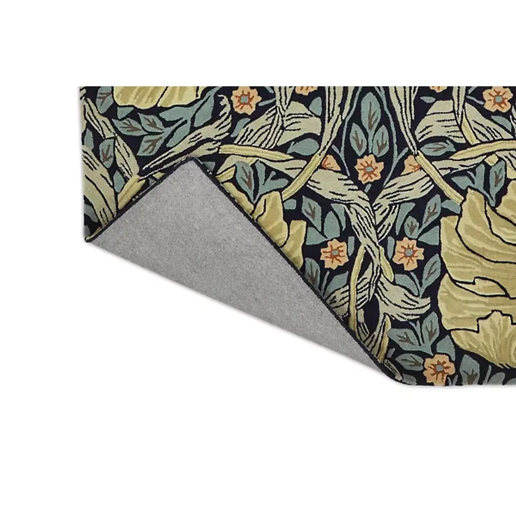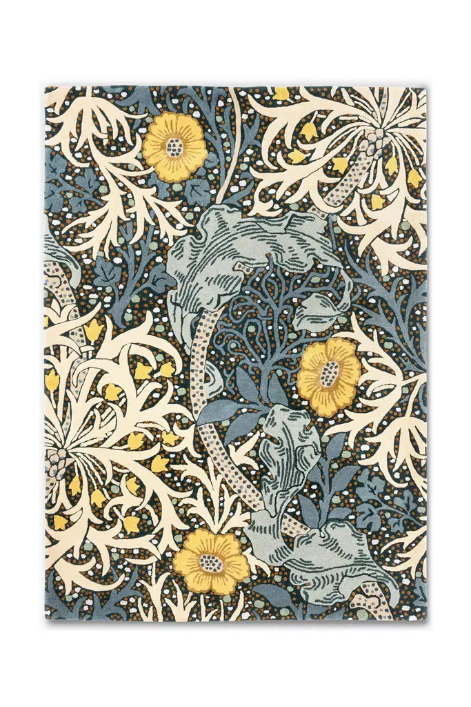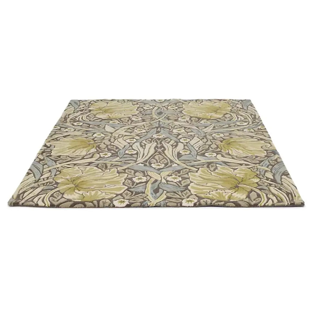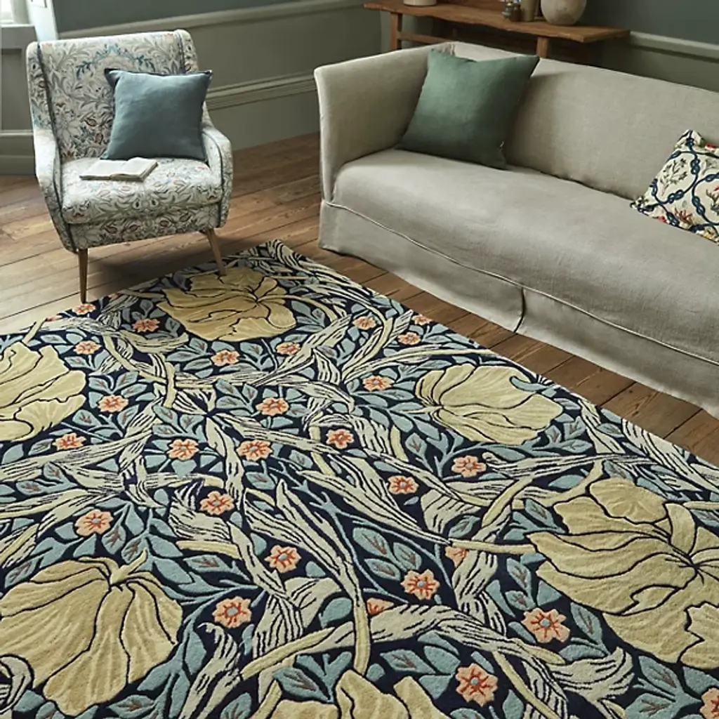 The Pimpernel Area Rug from Morris & Co shows off a swirling vintage pattern created by William Morris. Woven from new wool by Indian artisan hands, each rug is subtly distinct, adding a soft layer of comfort to its surroundings. The swirling vines and graceful blossoms race across its surface, as the rich green leaves contrast well with the pale blossoms, creating a memorable, artistic character.