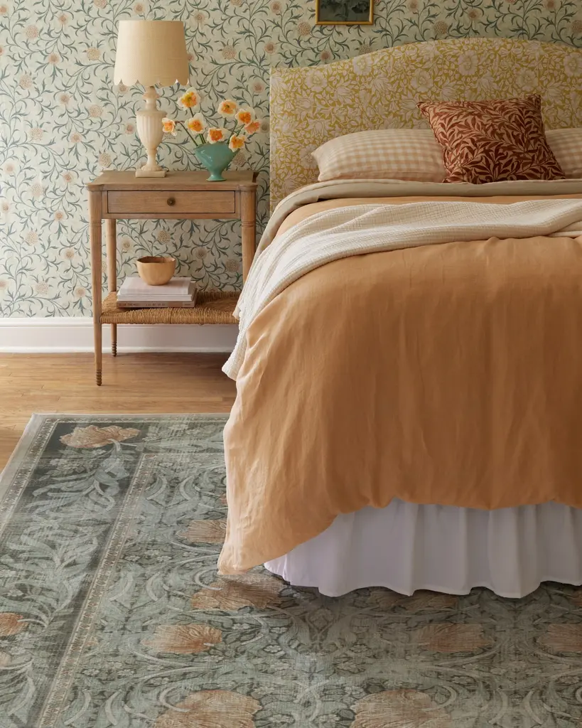 Our Morris & Co. Pimpernel Jade Rug brings the rhythmic florals of William Morris' famed wallpaper to the floor with refined elegance. The interlocking vines and tulips that once scaled Morris's own dining room in his Kelmscott House are now framed with an ornate border that helps define any space. Warm blooms sing atop textured cool grey and blue-greens for a natural color scheme inspired by the English countryside. Water-resistant, stain-resistant, and machine-washable. Rug colors may vary slightly according to your device and the lighting in your space.