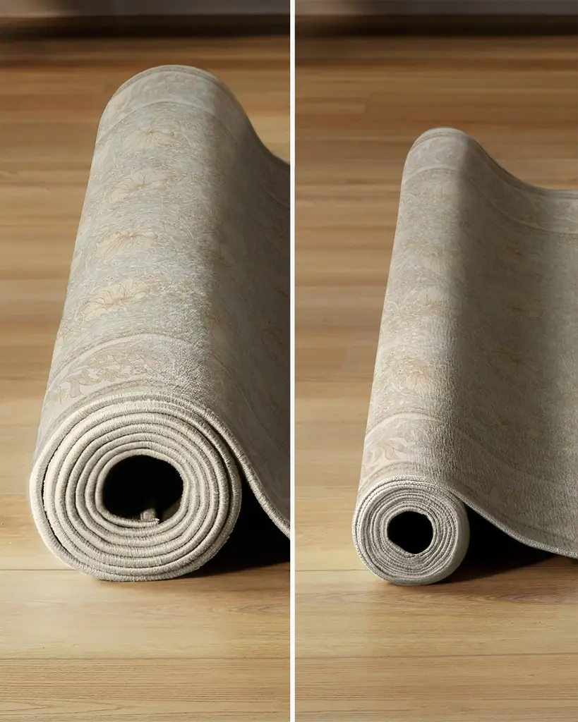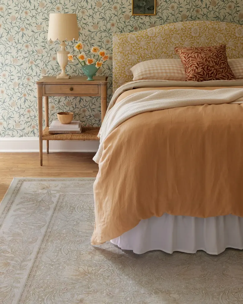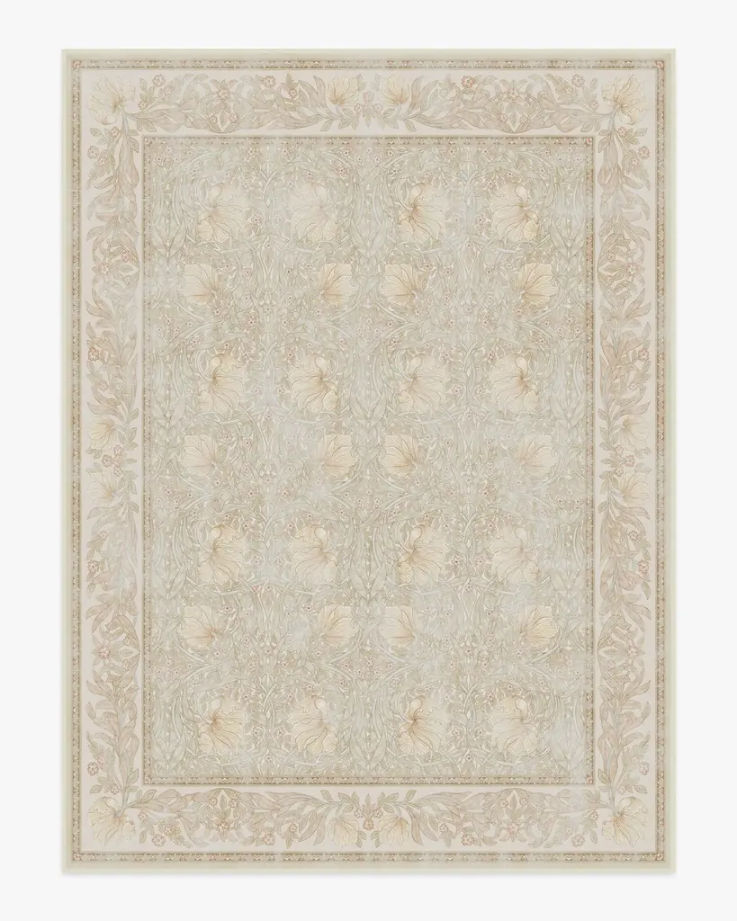 Our Morris & Co. Pimpernel Vintage Blush Rug brings the rhythmic florals of William Morris' famed wallpaper to the floor with refined elegance. The interlocking vines and tulips that once scaled Morris's own dining room in his Kelmscott House are now framed with an ornate border that helps define any space. A decadent mix of beige, cream, blush and grey bring a lighter touch to this intricate pattern. Water-resistant, stain-resistant, and machine-washable. Rug colors may vary slightly according to your device and the lighting in your space.