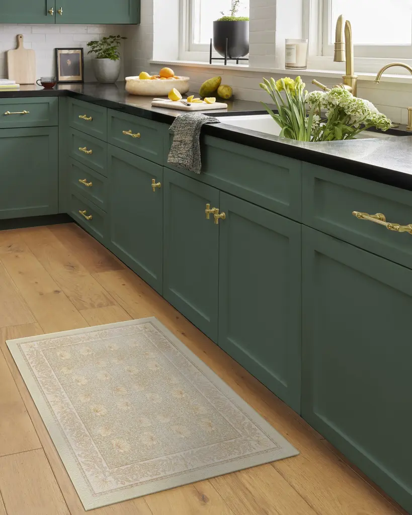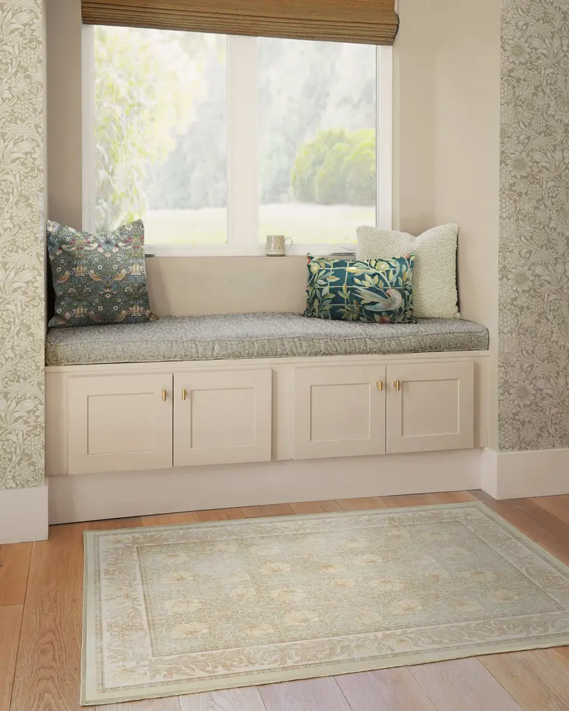 Our Morris & Co. Pimpernel Vintage Blush Rug brings the rhythmic florals of William Morris' famed wallpaper to the floor with refined elegance. The interlocking vines and tulips that once scaled Morris's own dining room in his Kelmscott House are now framed with an ornate border that helps define any space. A decadent mix of beige, cream, blush and grey bring a lighter touch to this intricate pattern. Water-resistant, stain-resistant, and machine-washable. Rug colors may vary slightly according to your device and the lighting in your space.