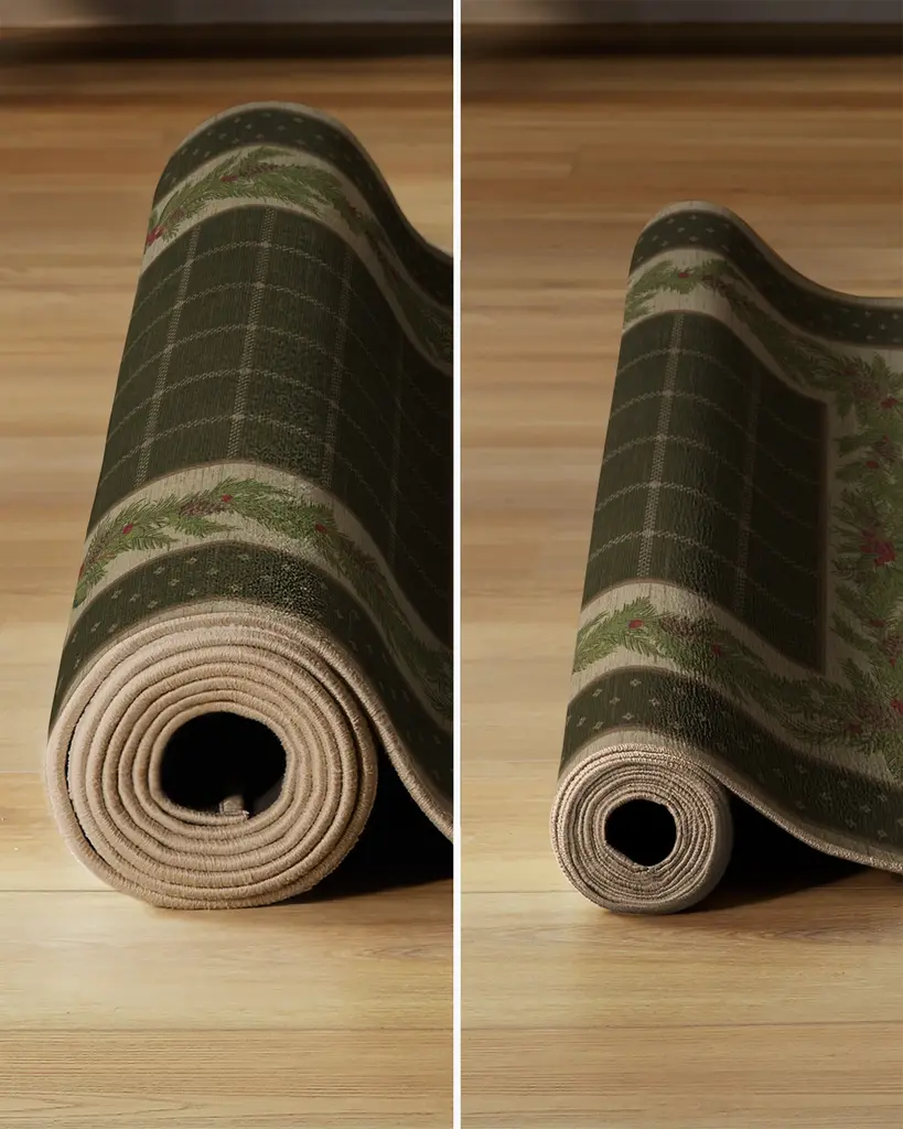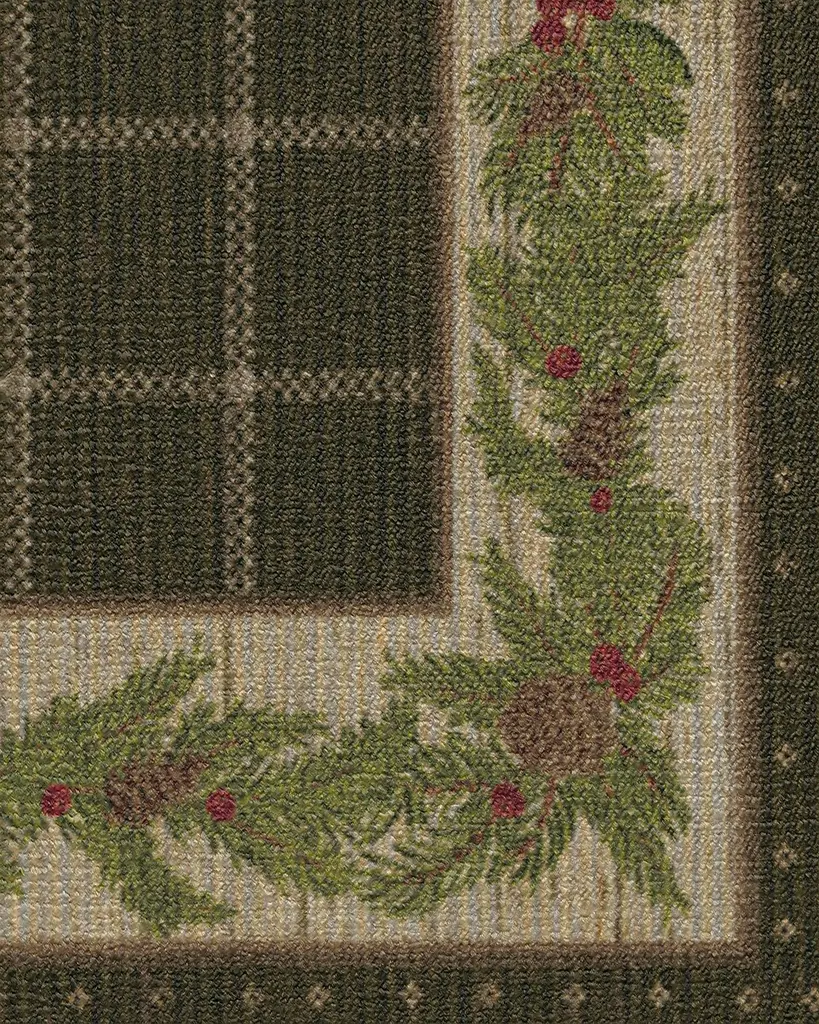 Our Pine Border Dark Olive Rug is the perfect centerpiece for holiday celebrations. Inspired by traditional holiday decor, this winter design features a seasonal, pine border with hints of holly berries and delicate filigree, elegantly framed by an outer decorative foulard border and a checkered field. The color palette showcases dark olive green tones complemented by warm neutrals and bright pine greens, accented with pops of berry hues. Water-resistant, stain-resistant, and machine-washable. Rug colors may vary slightly according to your device and the lighting in your space.
