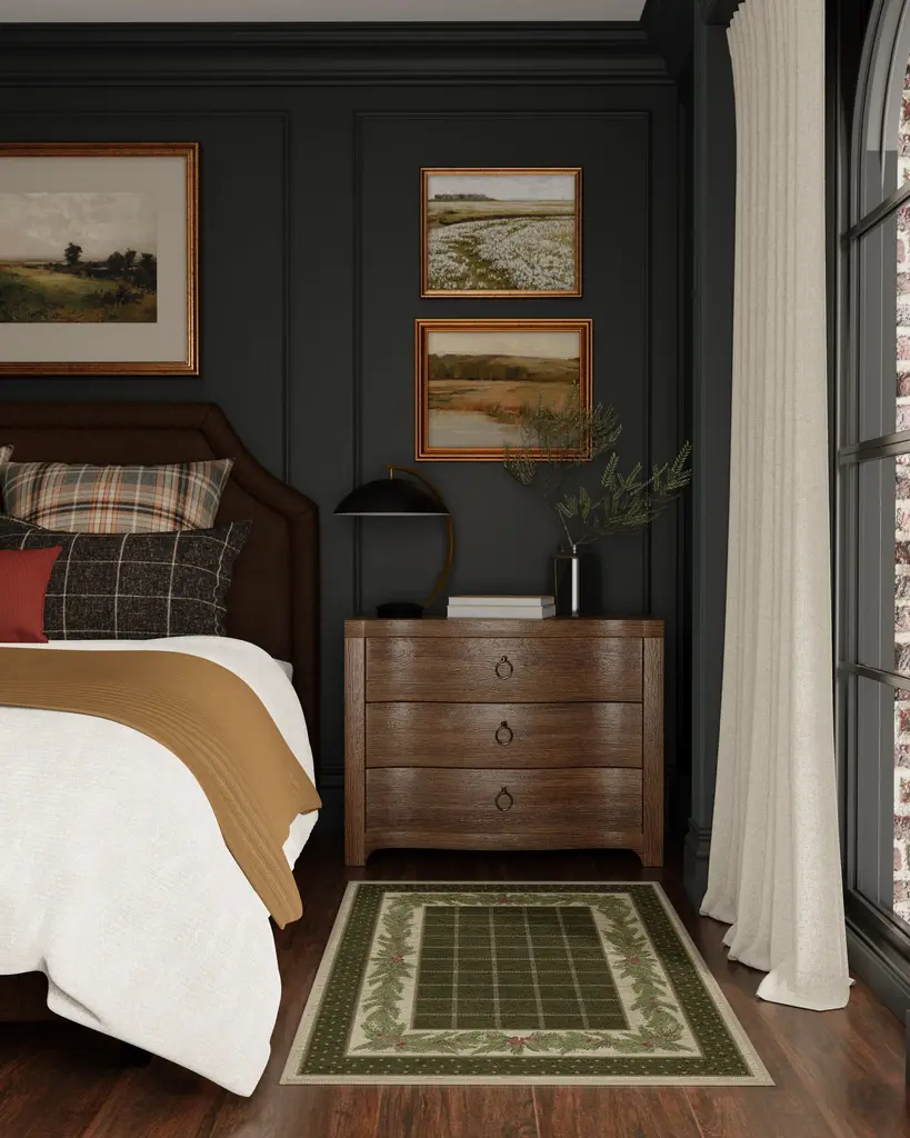 Our Pine Border Dark Olive Rug is the perfect centerpiece for holiday celebrations. Inspired by traditional holiday decor, this winter design features a seasonal, pine border with hints of holly berries and delicate filigree, elegantly framed by an outer decorative foulard border and a checkered field. The color palette showcases dark olive green tones complemented by warm neutrals and bright pine greens, accented with pops of berry hues. Water-resistant, stain-resistant, and machine-washable. Rug colors may vary slightly according to your device and the lighting in your space.