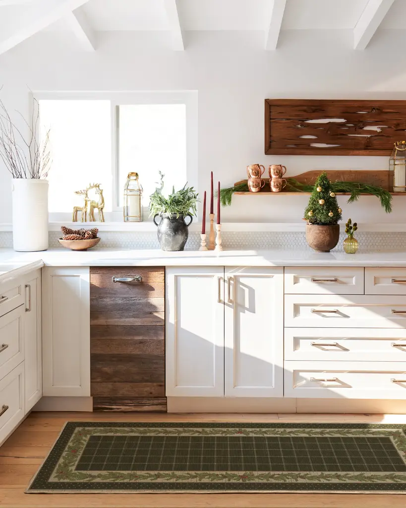 Our Pine Border Dark Olive Rug is the perfect centerpiece for holiday celebrations. Inspired by traditional holiday decor, this winter design features a seasonal, pine border with hints of holly berries and delicate filigree, elegantly framed by an outer decorative foulard border and a checkered field. The color palette showcases dark olive green tones complemented by warm neutrals and bright pine greens, accented with pops of berry hues. Water-resistant, stain-resistant, and machine-washable. Rug colors may vary slightly according to your device and the lighting in your space.