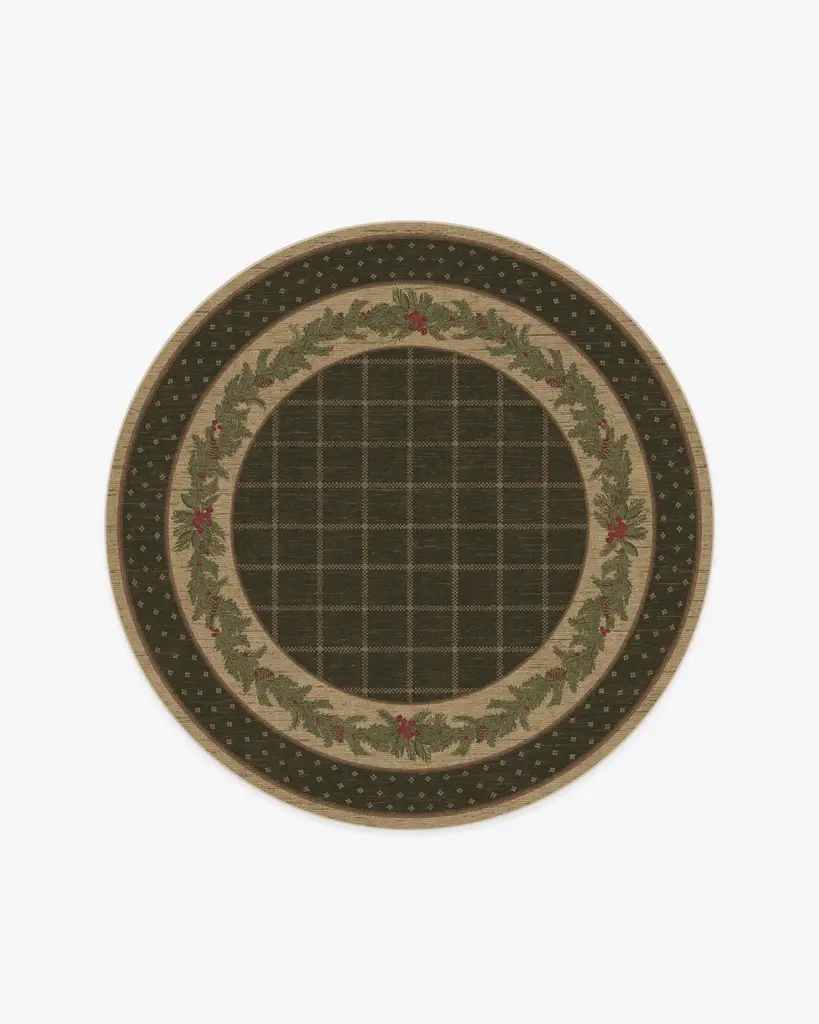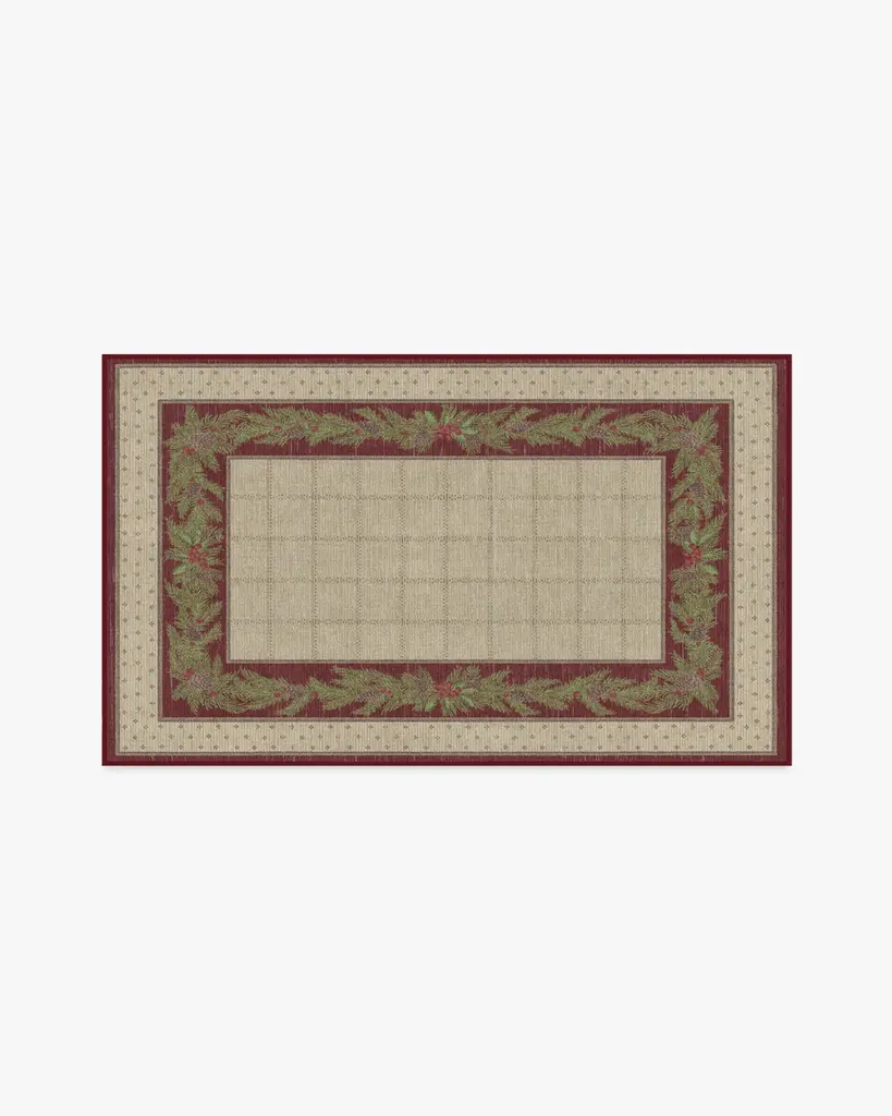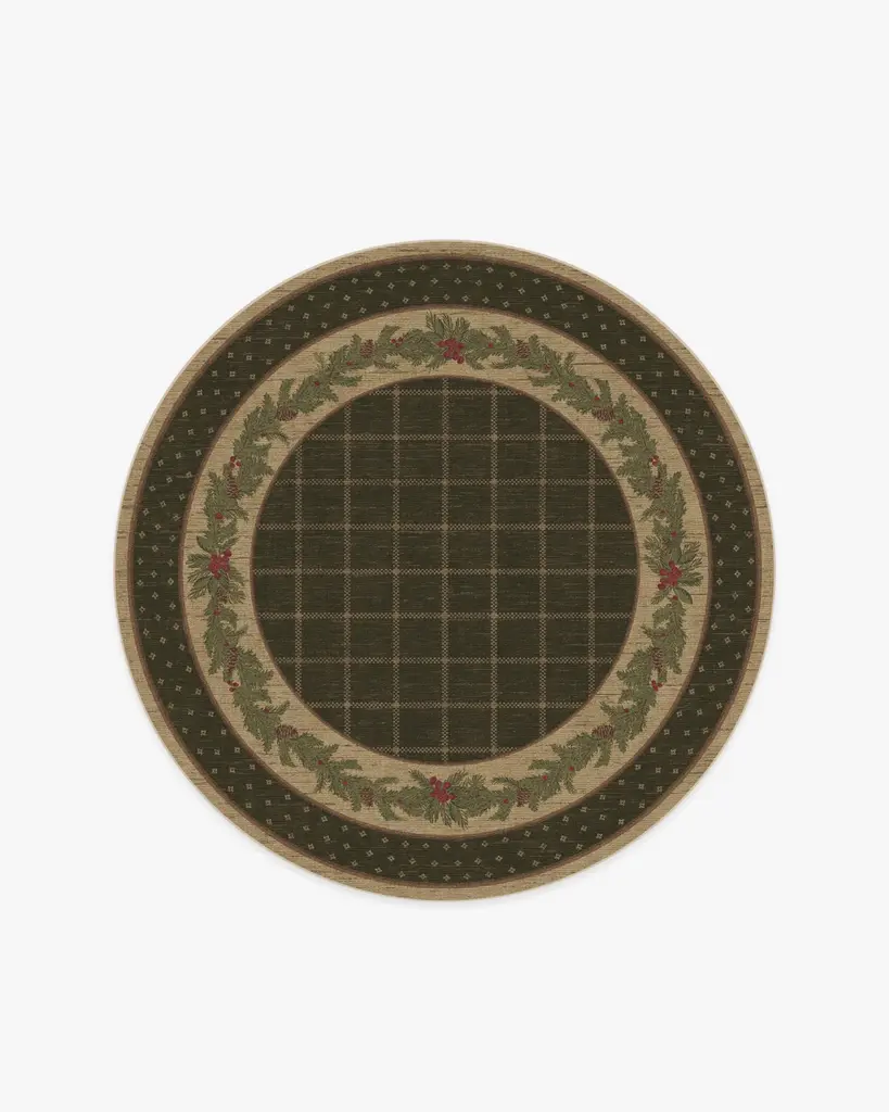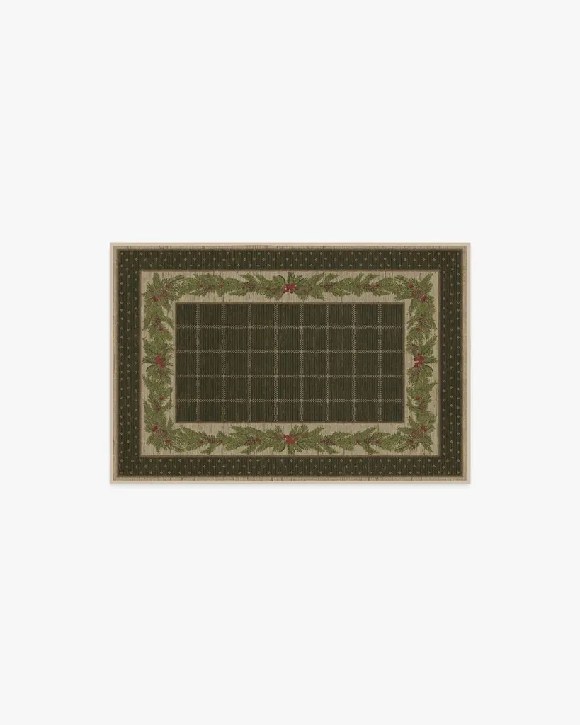 Our Pine Border Dark Olive Rug is the perfect centerpiece for holiday celebrations. Inspired by traditional holiday decor, this winter design features a seasonal, pine border with hints of holly berries and delicate filigree, elegantly framed by an outer decorative foulard border and a checkered field. The color palette showcases dark olive green tones complemented by warm neutrals and bright pine greens, accented with pops of berry hues. Water-resistant, stain-resistant, and machine-washable. Rug colors may vary slightly according to your device and the lighting in your space.