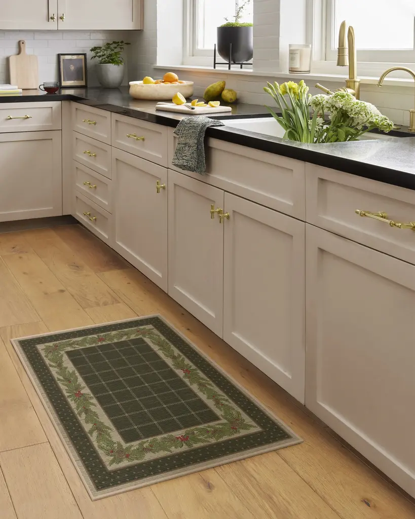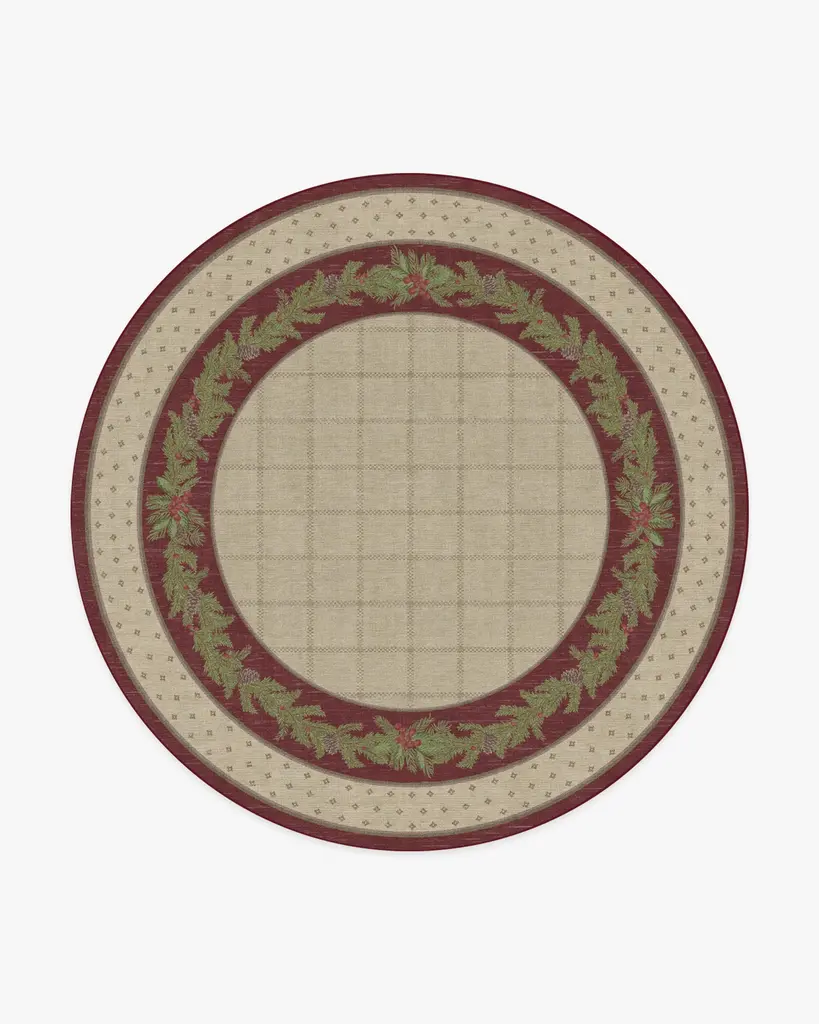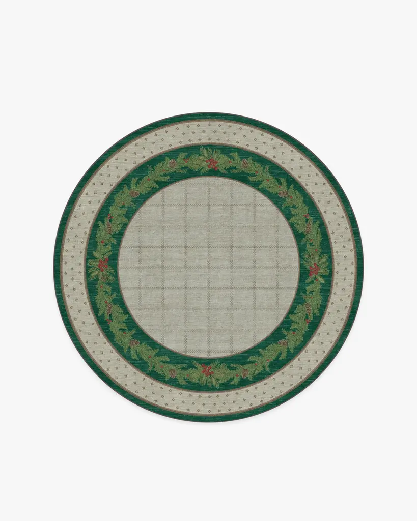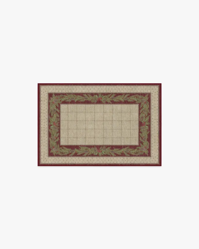 Our Pine Border Dark Olive Rug is the perfect centerpiece for holiday celebrations. Inspired by traditional holiday decor, this winter design features a seasonal, pine border with hints of holly berries and delicate filigree, elegantly framed by an outer decorative foulard border and a checkered field. The color palette showcases dark olive green tones complemented by warm neutrals and bright pine greens, accented with pops of berry hues. Water-resistant, stain-resistant, and machine-washable. Rug colors may vary slightly according to your device and the lighting in your space.