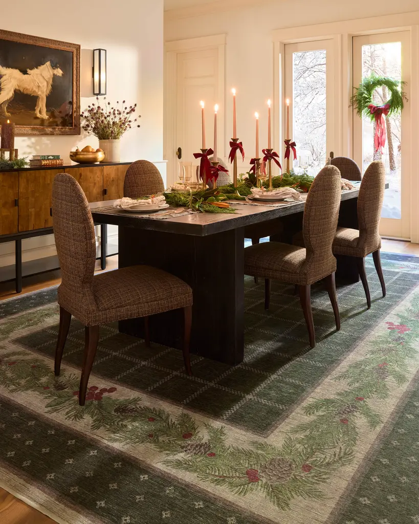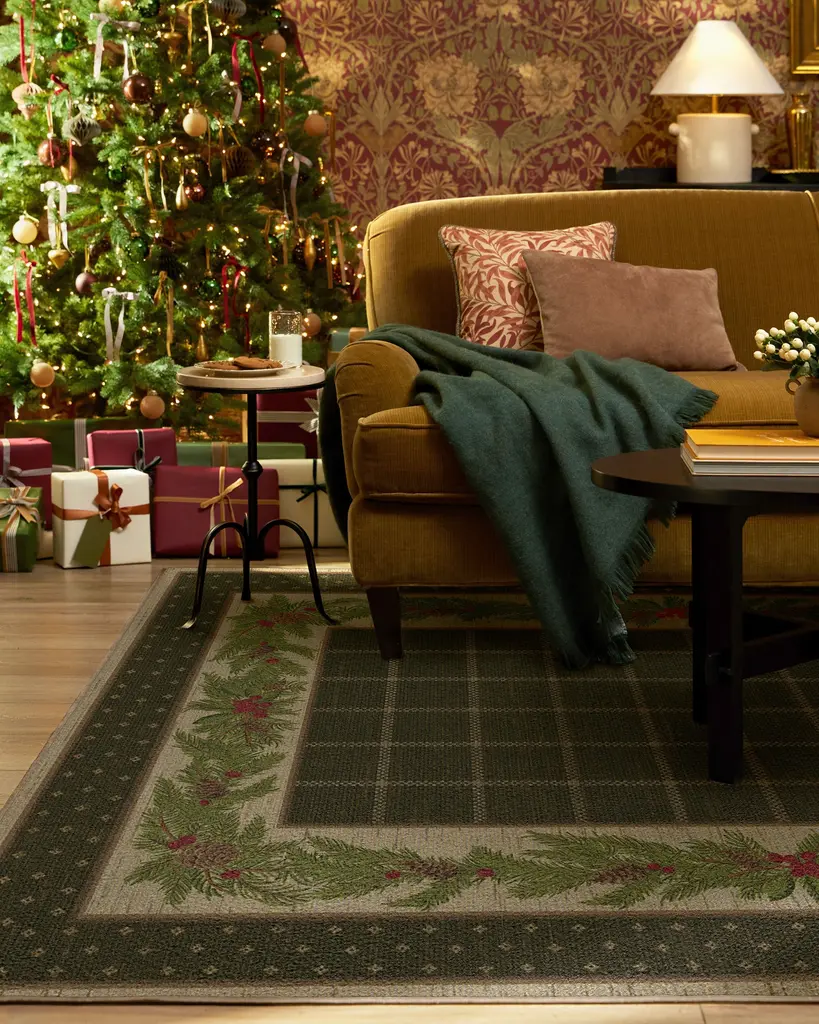 Our Pine Border Dark Olive Rug is the perfect centerpiece for holiday celebrations. Inspired by traditional holiday decor, this winter design features a seasonal, pine border with hints of holly berries and delicate filigree, elegantly framed by an outer decorative foulard border and a checkered field. The color palette showcases dark olive green tones complemented by warm neutrals and bright pine greens, accented with pops of berry hues. Water-resistant, stain-resistant, and machine-washable. Rug colors may vary slightly according to your device and the lighting in your space.
