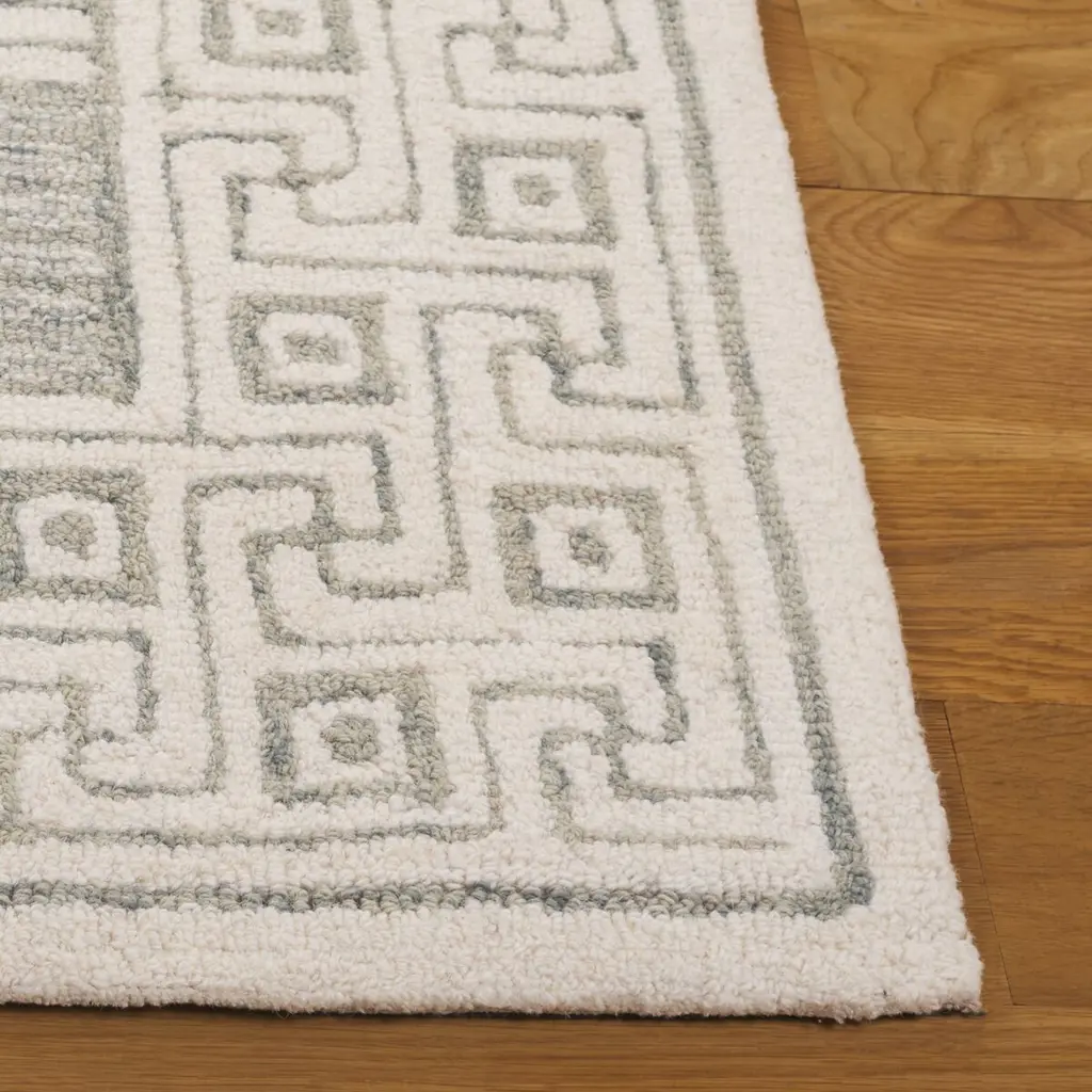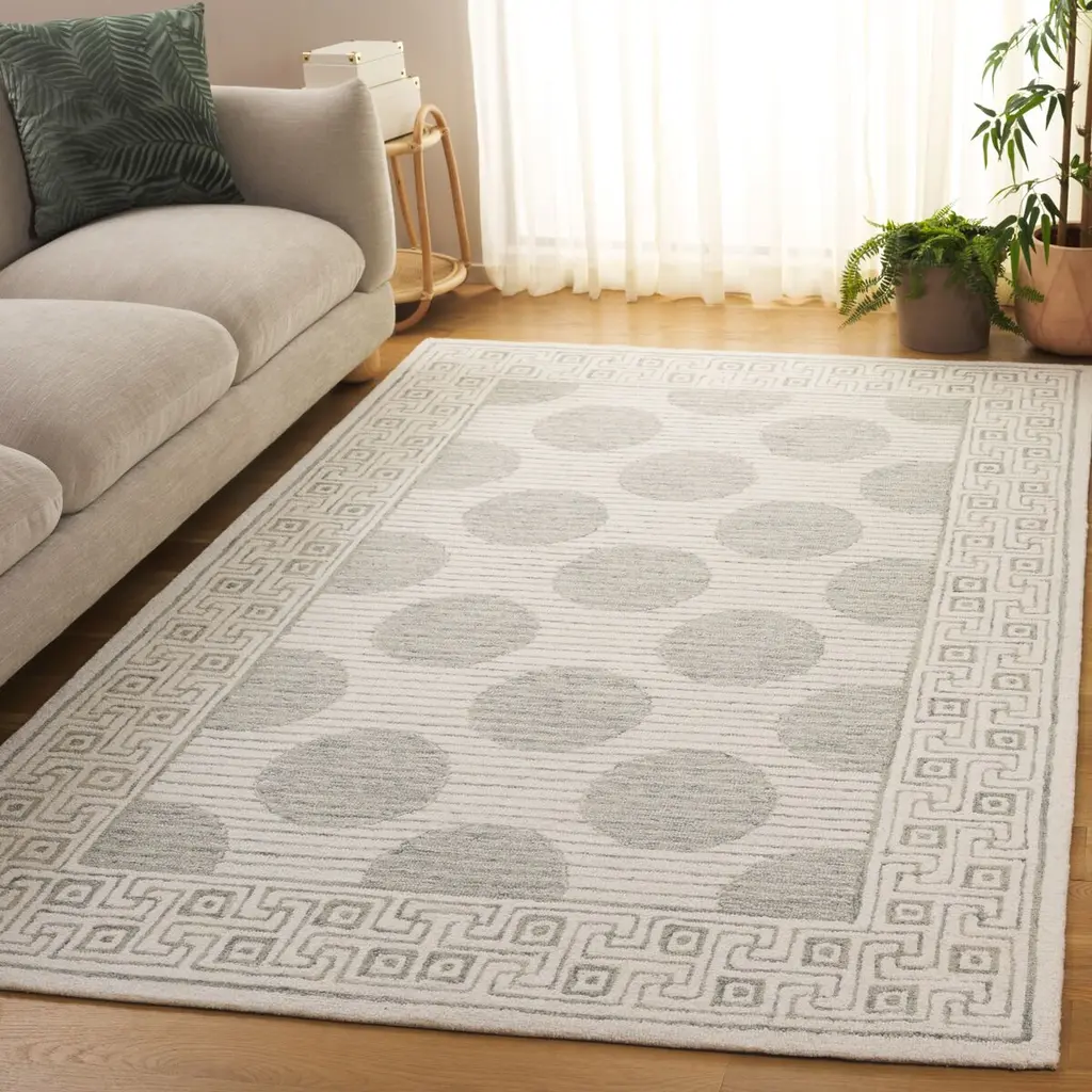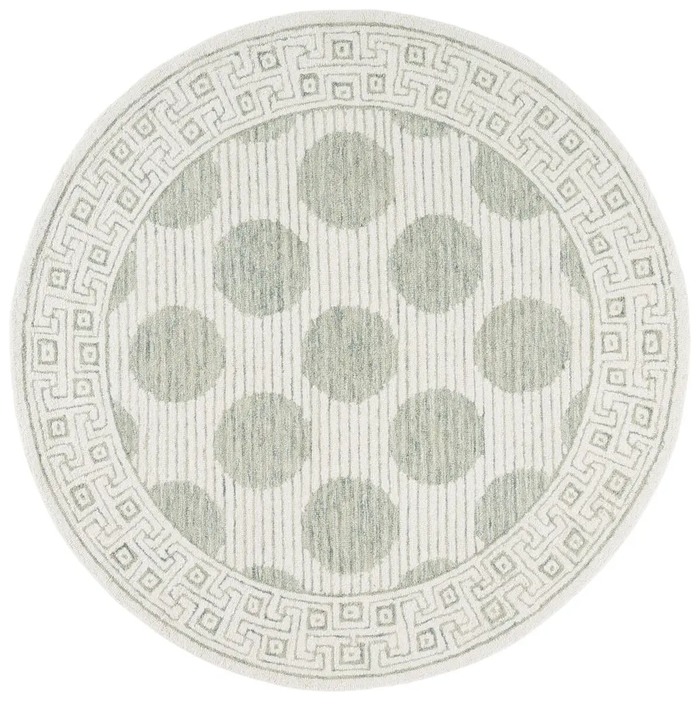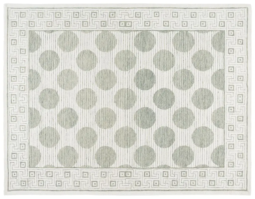 Elevate your living space with the sophisticated charm of our modern Sage/Ivory area rug. This small rectangle rug, sized 3 feet by 5 feet, features a plush 3/8 inch pile height that provides a luxurious underfoot experience. Hand-tufted in India with meticulous attention to detail, this rug is constructed from a premium blend of 80% wool for warmth and durability, 10% cotton for a soft touch, and 10% latex for resilience. The rug showcases a contemporary pattern, where elegant ivory spheres are set against a serene sage background, adding a touch of geometric intrigue to your decor. The border is adorned with a classic Greek key design, framing the piece and giving it a timeless aesthetic. Perfect for adding a modern yet classic touch to any room, this rug's versatile color palette and distinctive design will complement a wide range of interior styles. Each rug is a testament to the artisanal craftsmanship, bringing a piece of Indian heritage into your home. Whether placed in your living room, bedroom, or study, this area rug will create an inviting atmosphere and act as a focal point for your furnishings. Indulge in the blend of beauty and quality with our artisan-crafted area rug.