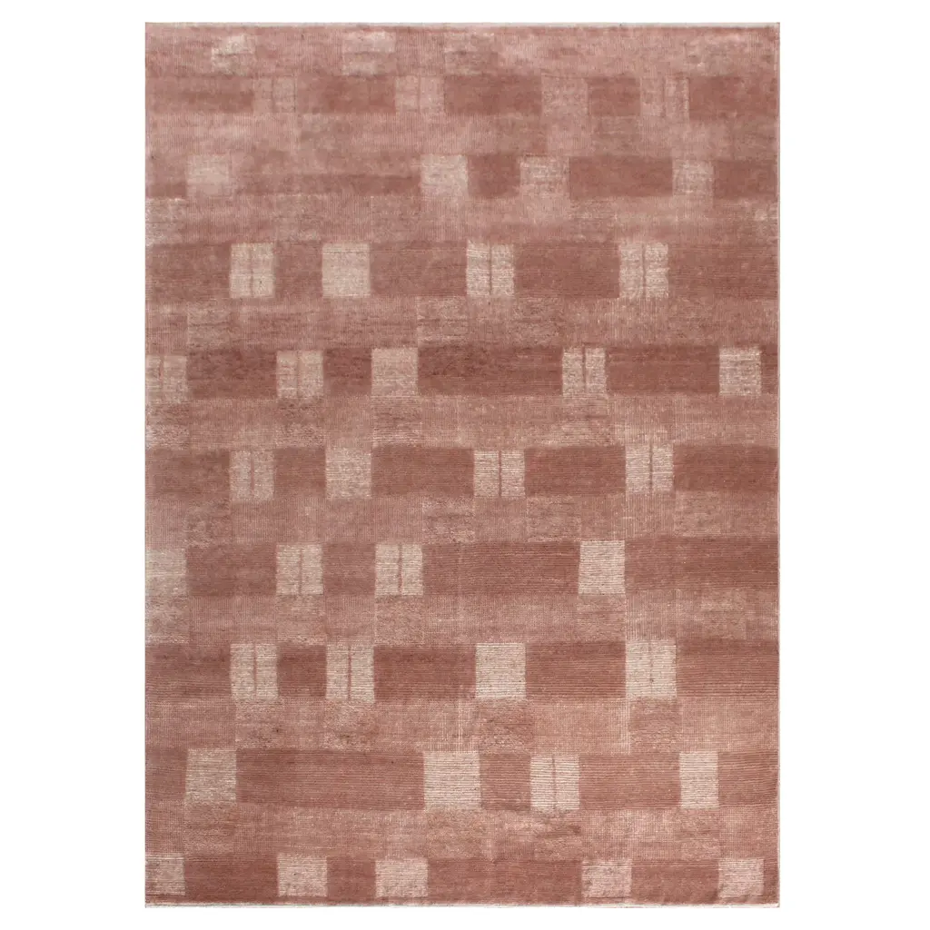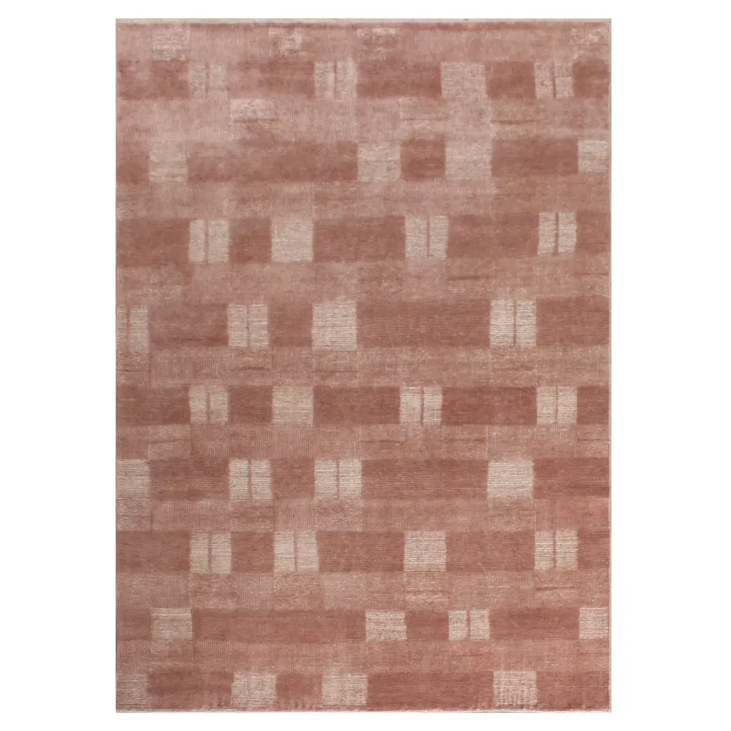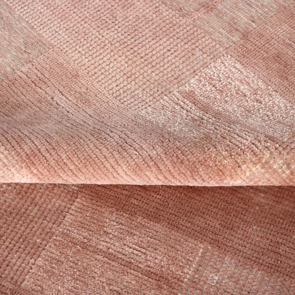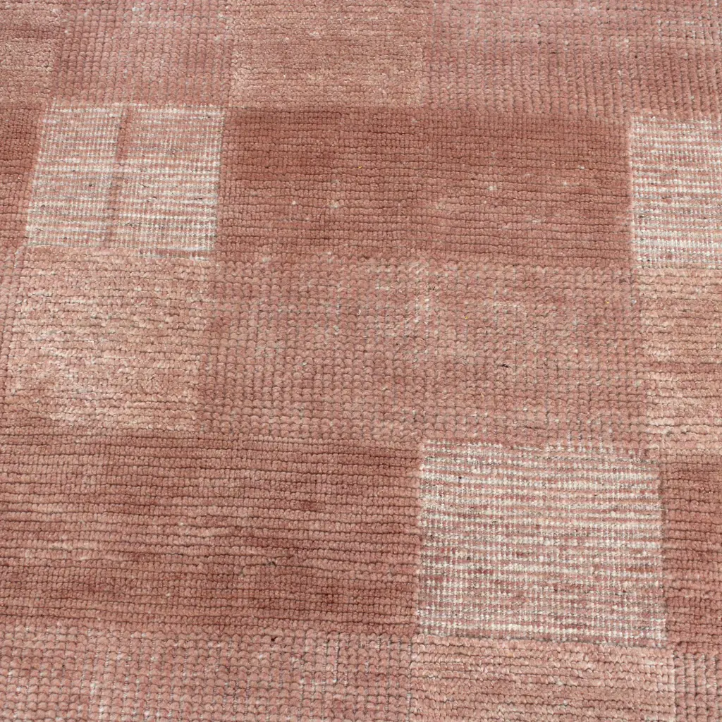 This Pink Contemporary Wool Rug from India is a hand-knotted masterpiece. This rectangular contemporary rug features a textured, patchwork pattern with a blend of light and dark shades of muted pink. The harmonious design creates a subtle geometric effect, adding a touch of elegance to any space.