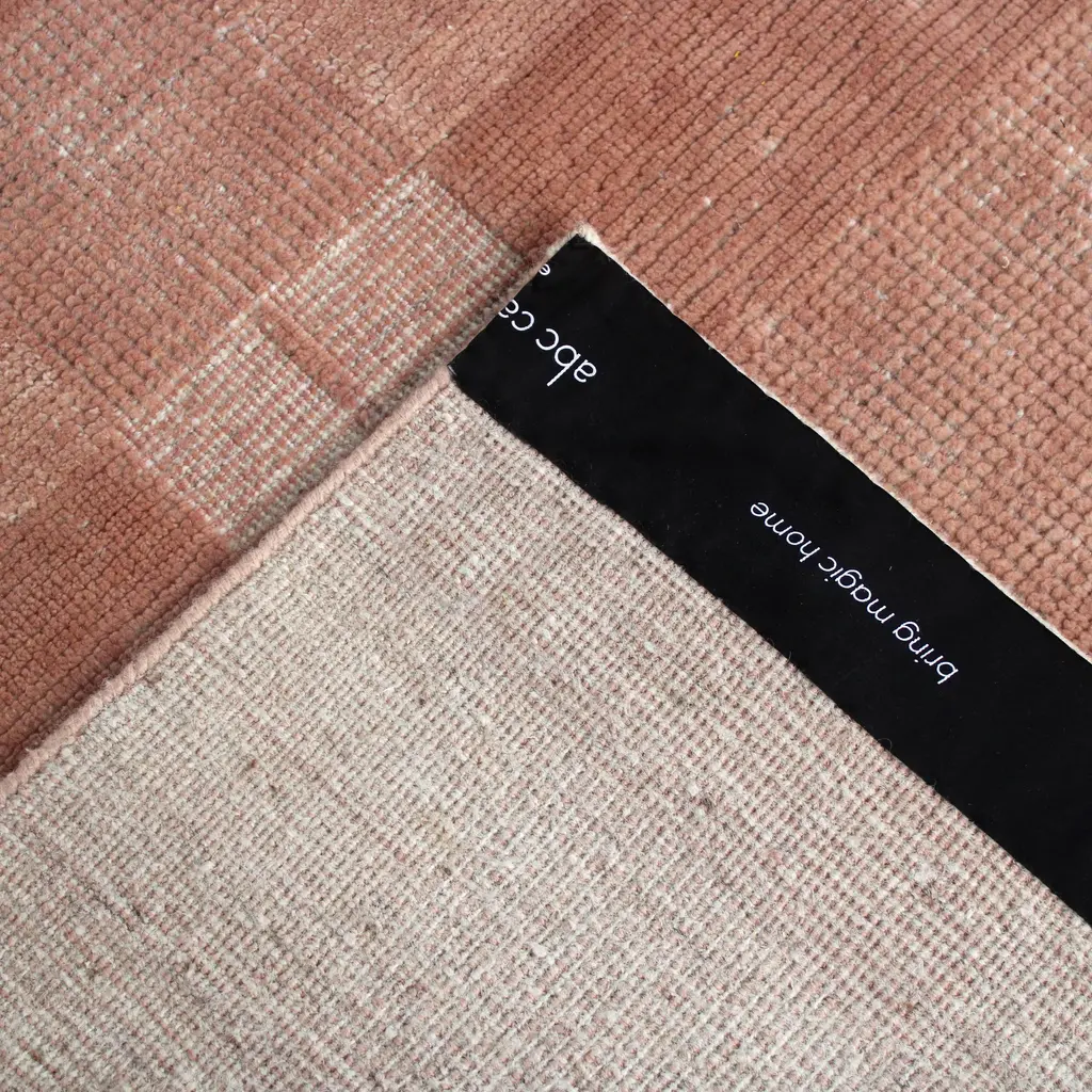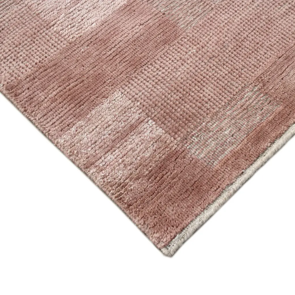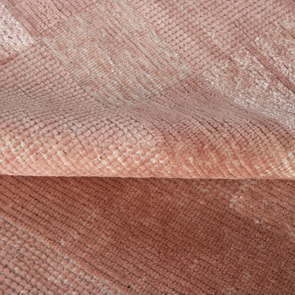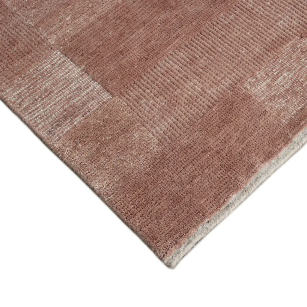This Pink Contemporary Wool Rug from India is a hand-knotted masterpiece. This rectangular contemporary rug features a textured, patchwork pattern with a blend of light and dark shades of muted pink. The harmonious design creates a subtle geometric effect, adding a touch of elegance to any space.