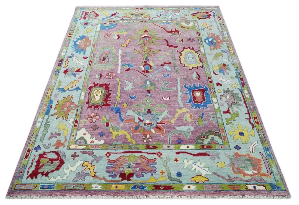 This luxurious rug boasts a stunning array of colors, with a soft lavender center layered with intricate motifs in bold reds, earthy greens, and vibrant blues. The surrounding border contrasts with a cool teal base, adorned with abstract floral and geometric patterns. The intricate design is reminiscent of traditional Persian influences, offering an eclectic mix of contemporary and classic aesthetics. Its texture is richly woven, resulting in a plush, inviting surface suitable for a lavish home decor setting. Product Details Color: Pink and Blue Design: Oushak Material: Made with Soft Wool Construction: Hand-Knotted Knots Per Inch (KPI): 28 Availability: Other sizes are made to order in 30 - 60 days Care Guide Vacuum or shake to remove dust often Avoid long exposure to moisture Blot spills immediately with a white cloth Cut loose thread ends with scissors Avoid harsh chemicals for color Use rug protectors under heavy furniture