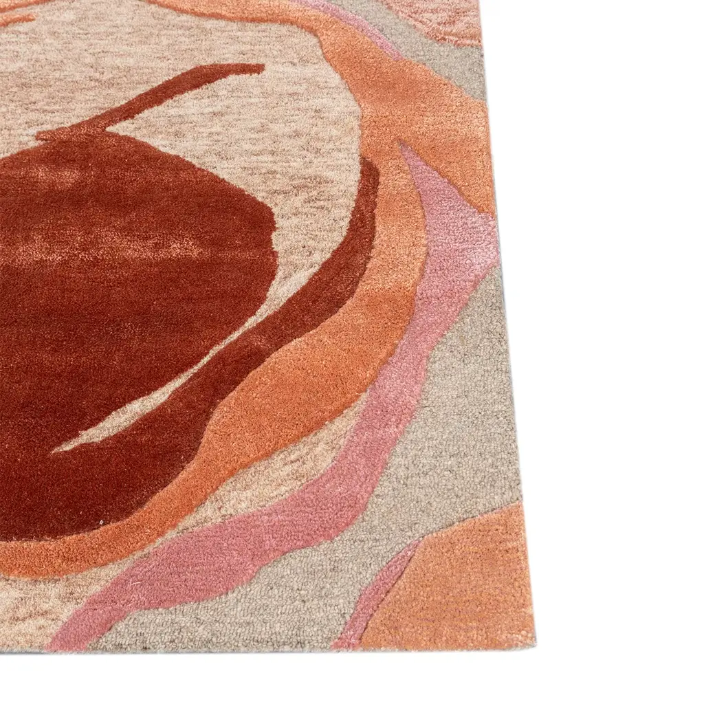 A hand-tufted rug featuring an abstract pattern of warm burnt red and pink hues. Crafted with a luxurious wool-viscose blend for a smooth sheen and inviting texture, this rug offers durability and a refined aesthetic suitable for contemporary interiors. Its design balances bold color accents with subtle background tones, delivering a sophisticated warmth and visual interest to modern living spaces. Slight variations in color, size, or pattern may occur. Made in India.