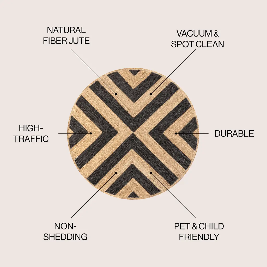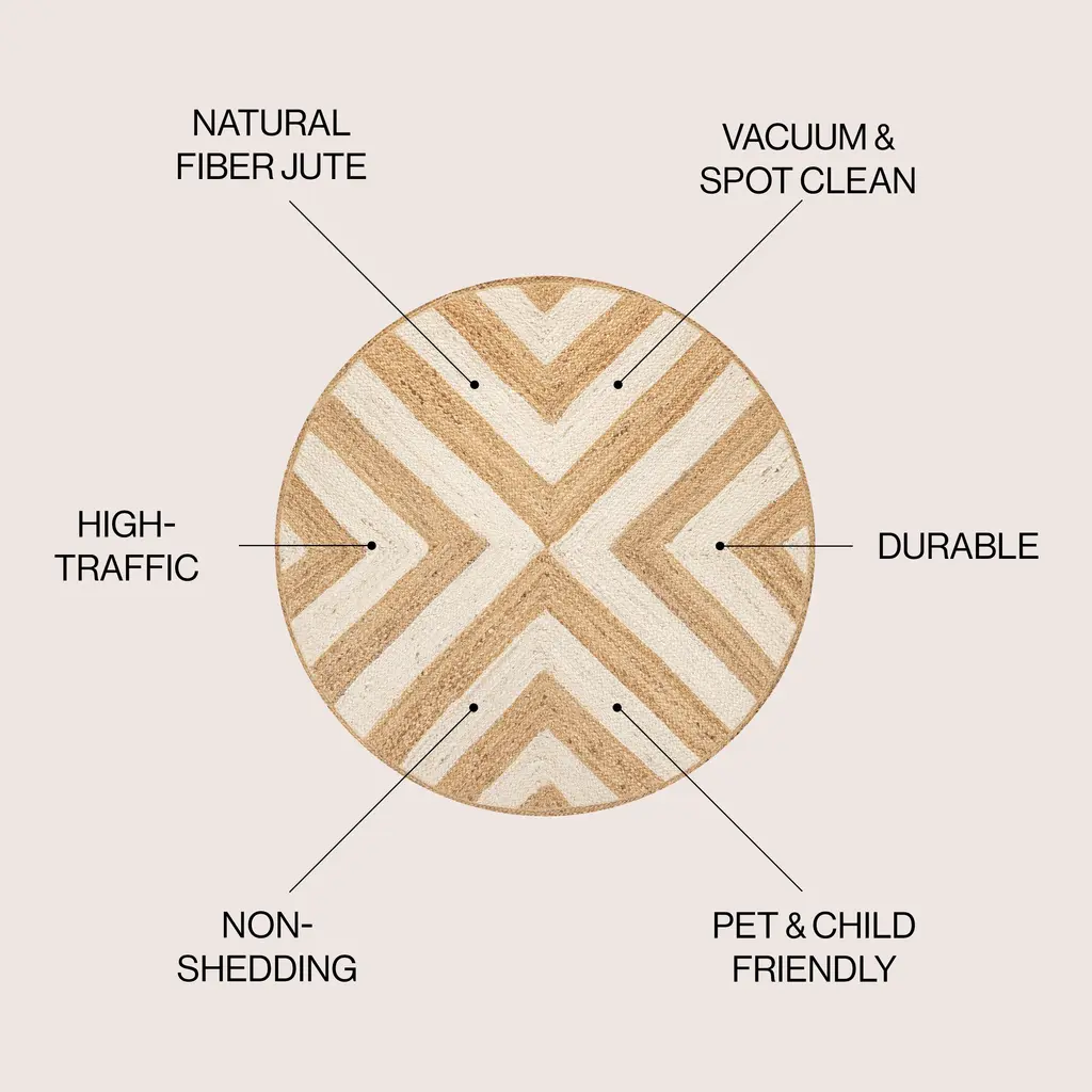 Chevron stripes add a modern touch to our round jute rug. The two-tone design is handcrafted by skilled artisans from natural jute fibers. Add a splash of pattern to the living room, home office or bedroom with our easy-care natural fiber rug.