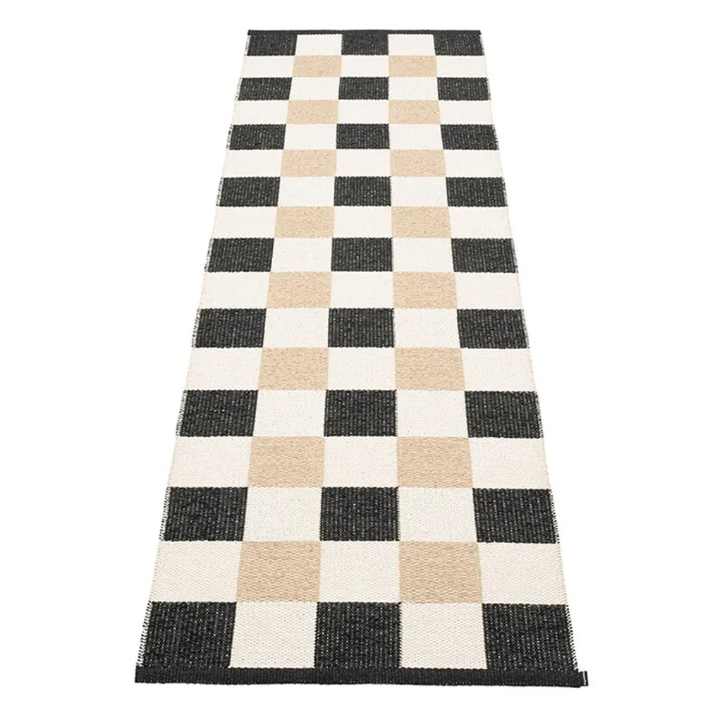 Pappelina's Pix rug features a classic checkered pattern woven in three different colors. The double-folded edges are hemmed with a strong seam, and one corner has a sewn-on rubber label with a Pappelina logo. The Pix rug can be washed by hand or in a washing machine. Made of phthalate-free PVC ribbon, the plastic rug is very easy to clean, making it a practical choice for all spaces from the kids' room to the kitchen. It can even be used outdoors on the balcony, veranda or patio. Made in Dalarna, Sweden, the Pix rug has been woven using traditional techniques and it is available in several colourways.