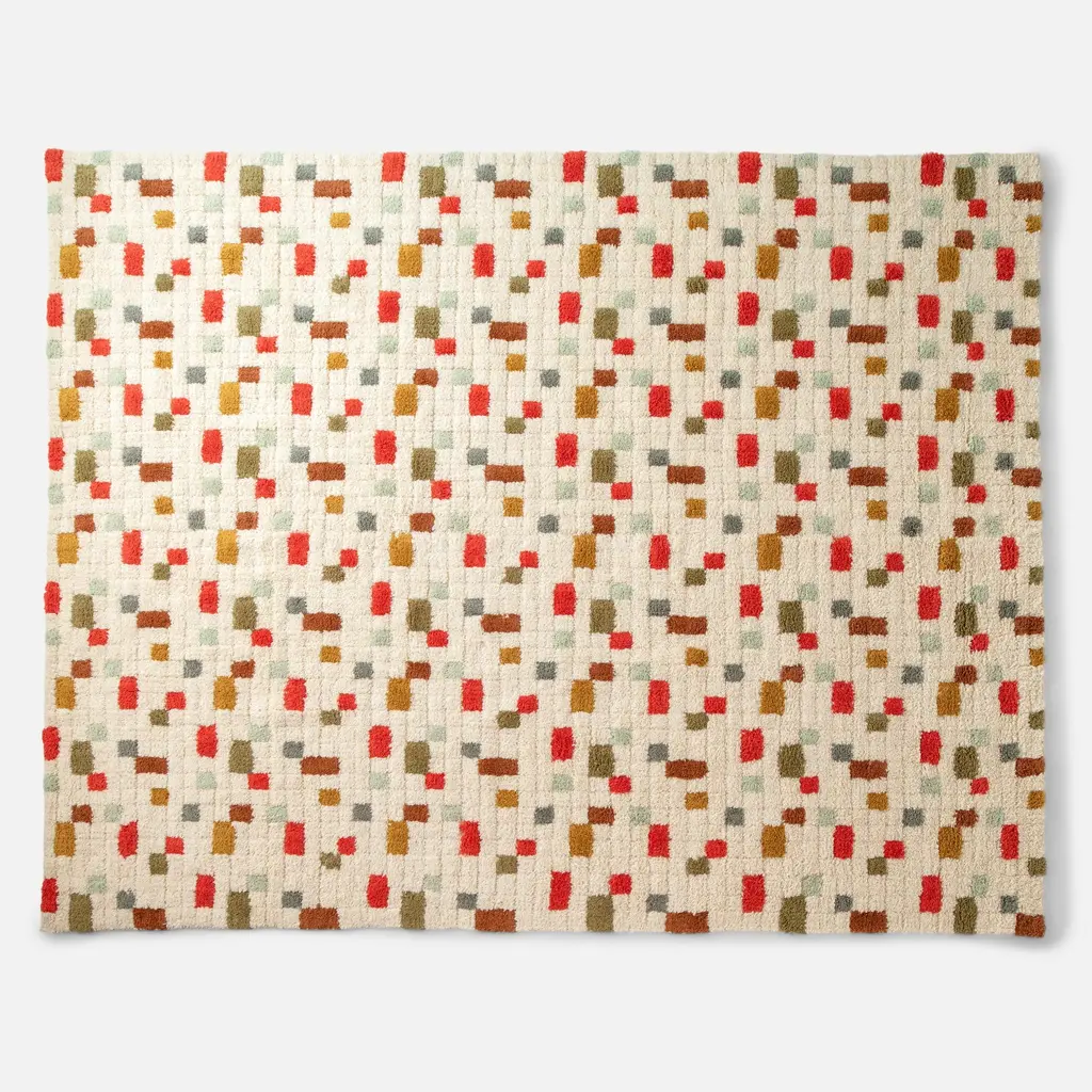 Crafted by master artisans in India, this rug's high pile texture provides a plush wool surface. And with a geometric pattern full of movement and earthy yet vibrant hues, it brings a playful, cozy touch to your decor.