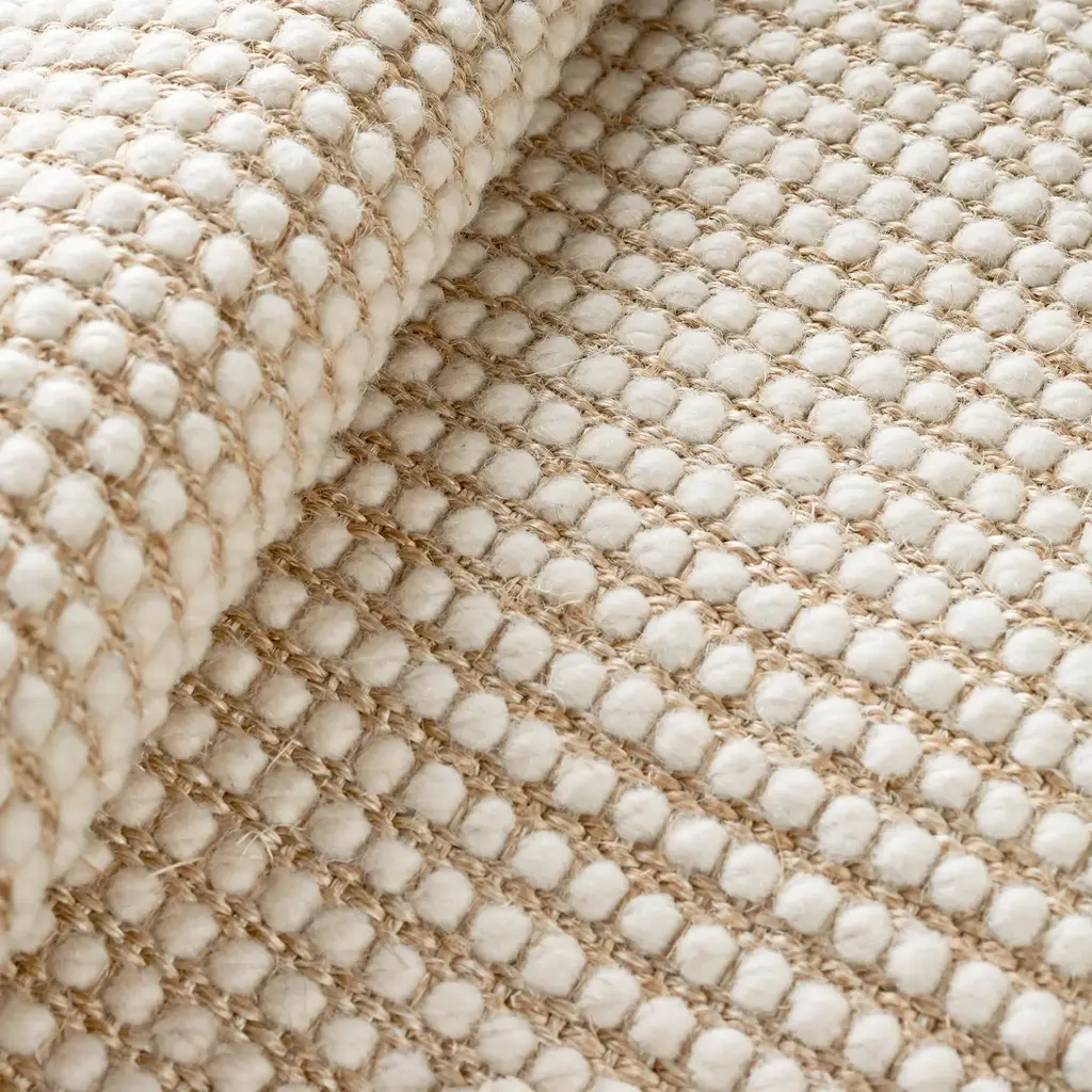 Mini popcorn in soft and warm ivory wool roving runs across a rustic sisal base in classic colors. Comforting and cozy, yet durable and low profile it can grace any room with natural, understated style.