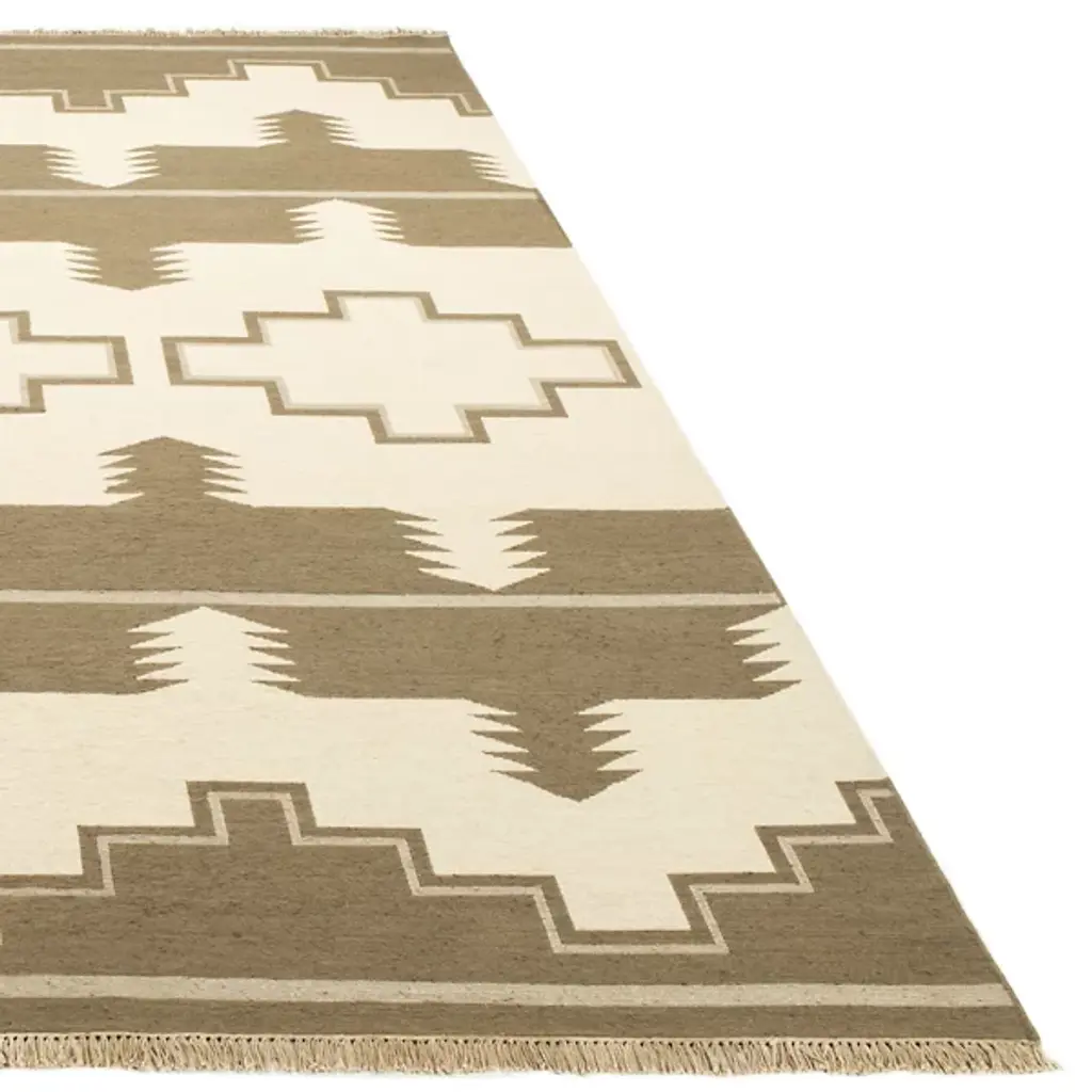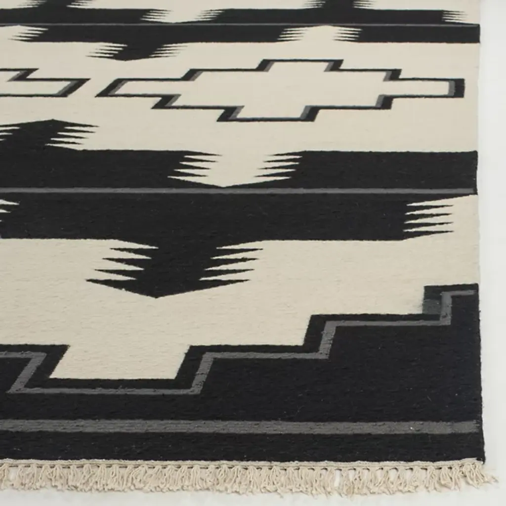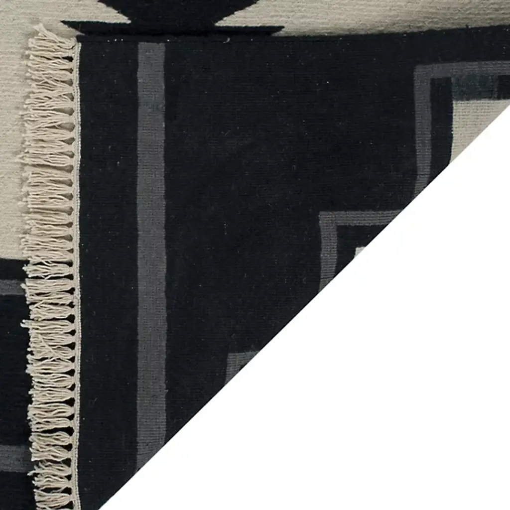 The Plains Creek Area Rug from Ralph Lauren showcases contemporary Southwestern-inspired weaving motifs on an oversized scale. Hand-knotted with soft wool fibers using traditional Soumak weaving, the rug features a beautiful brocade-stitch effect highlighting the natural material's character. Its fringe edges and reversible design with the geometric pattern on both sides add exquisite detail. Pure cotton yarns complement the luxurious wool base in the Black Mountain colorway.