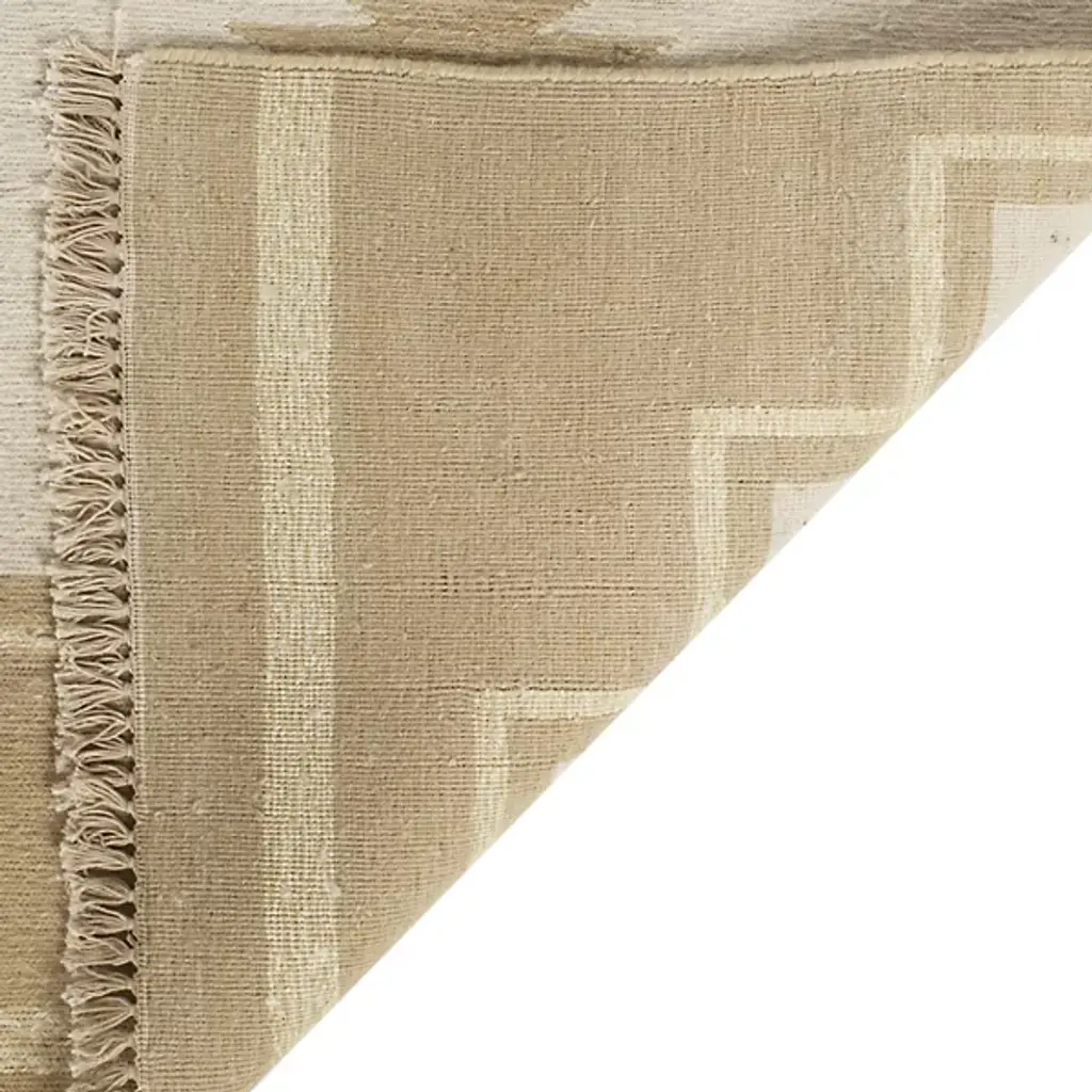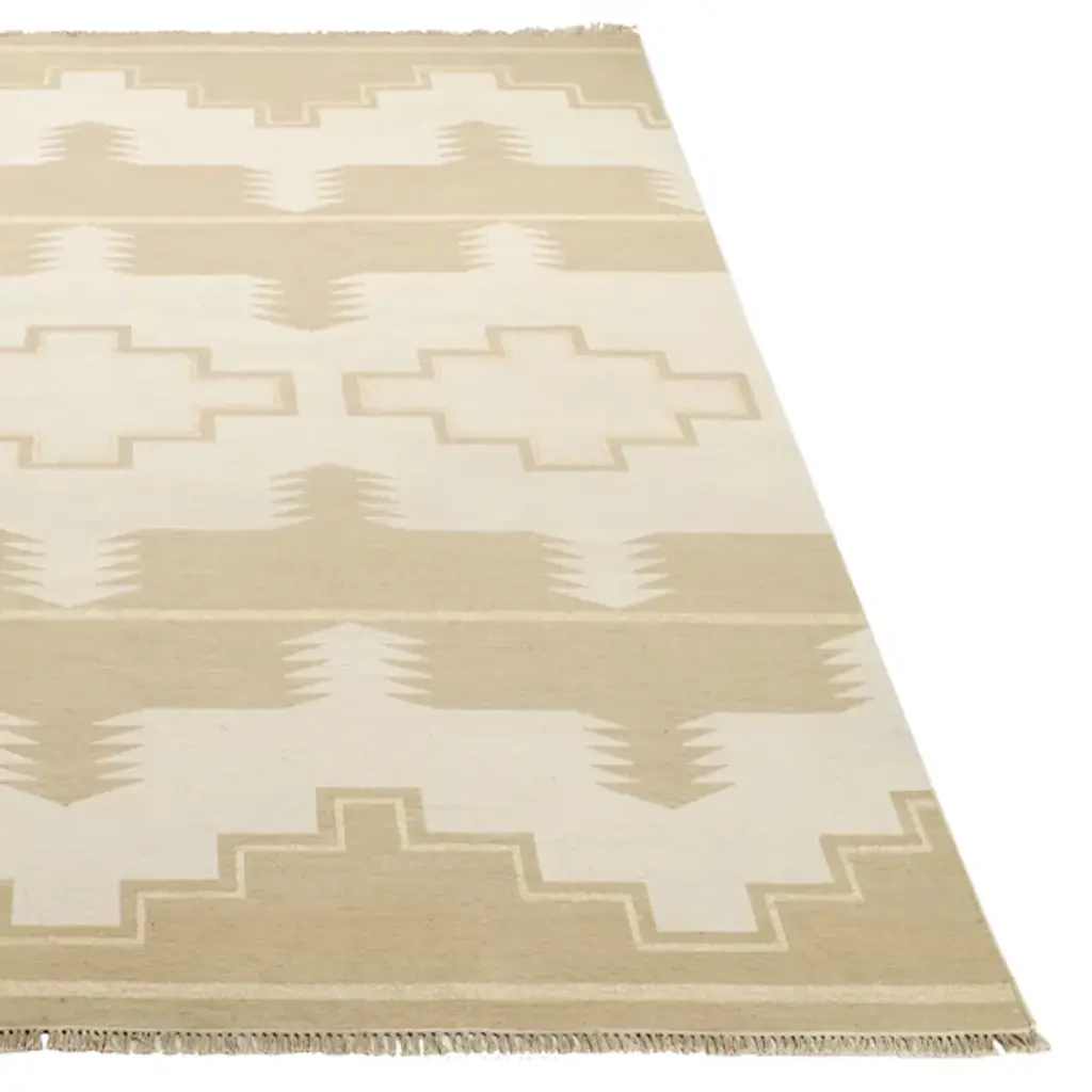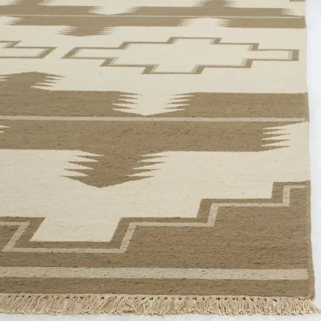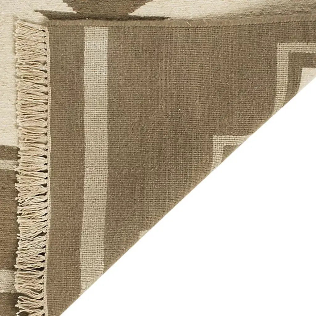 The Plains Creek Area Rug from Ralph Lauren showcases contemporary Southwestern-inspired weaving motifs on an oversized scale. Hand-knotted with soft wool fibers using traditional Soumak weaving, the rug features a beautiful brocade-stitch effect highlighting the natural material's character. Its fringe edges and reversible design with the geometric pattern on both sides add exquisite detail. Pure cotton yarns complement the luxurious wool base in the Black Mountain colorway.