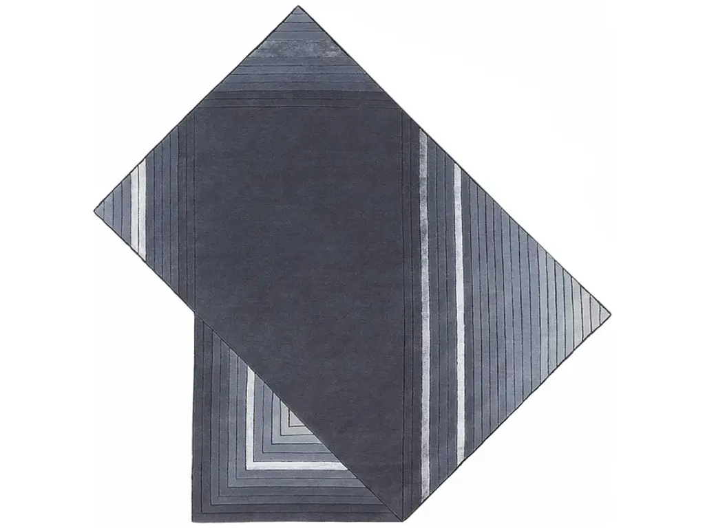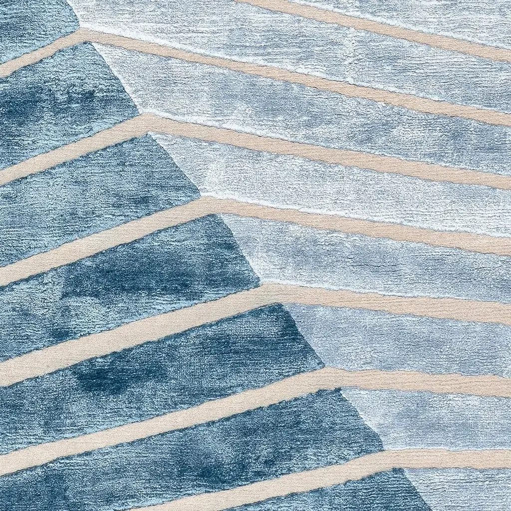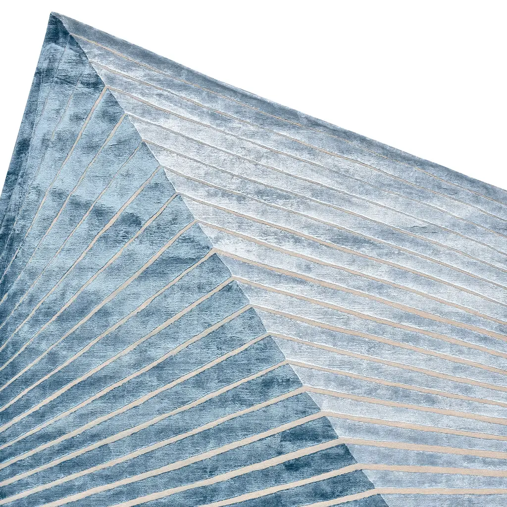 The epitome of the trompe-l'oeil technique, this stunning rug will take center stage in any contemporary context. The unexpectedly sculpted perimeter enhances the optical illusion of the .07cm-high design, splendidly achieved by Nepalese master craftsmen using 80% blue silk and 20% beige Himalayan wool. Reminiscent of an haute couture dress, this 152,000 knot/sqm piece features a .05cm-high base. Please contact the Concierge for customization inquiries and for pricing of the stain-resistant variant.