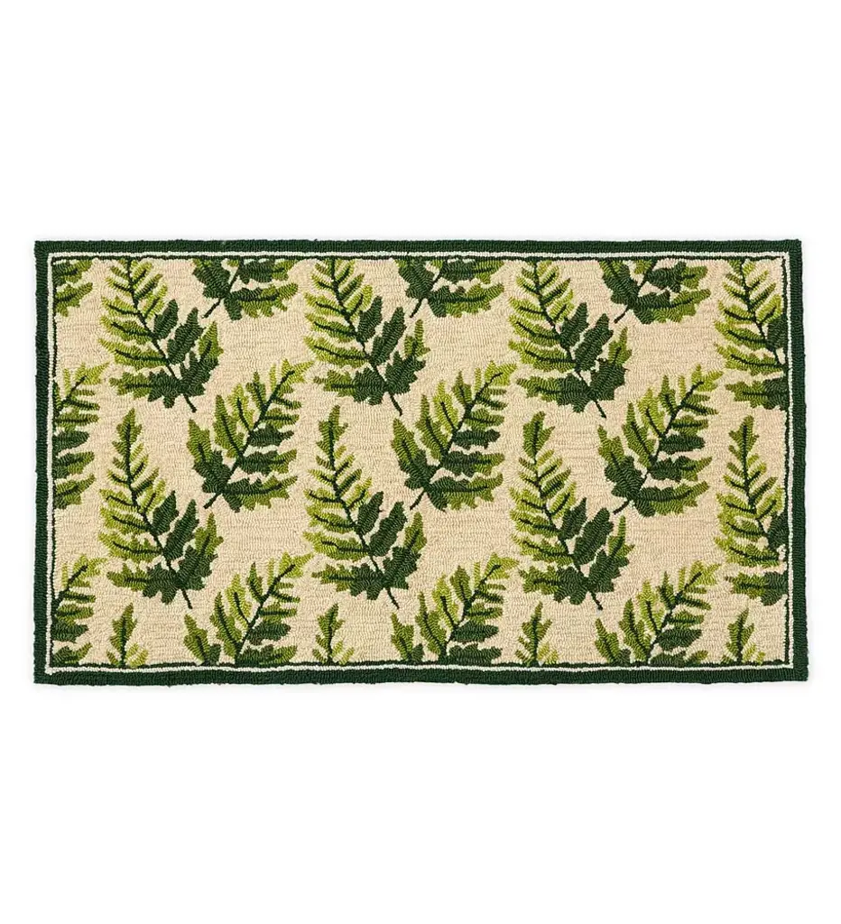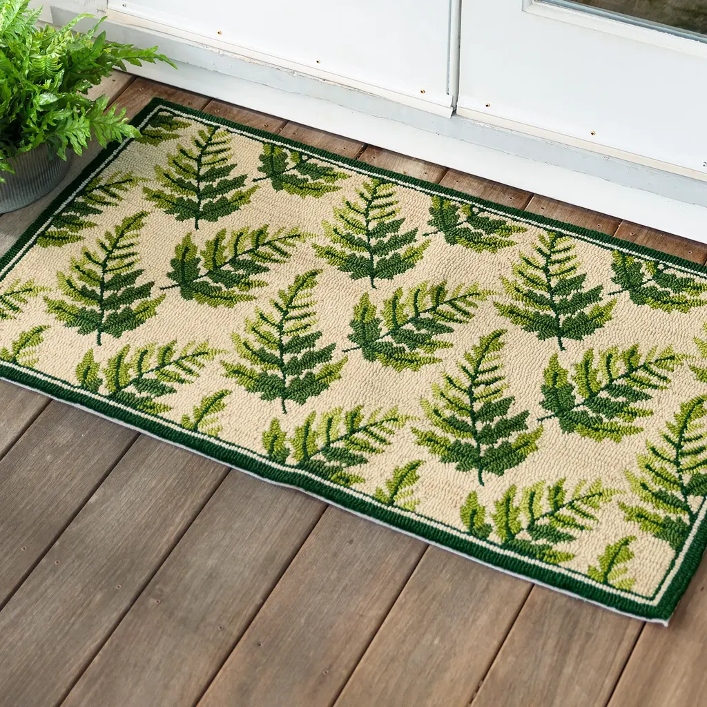 Pretty as a walk through the forest, our Fern Indoor/Outdoor Accent Rug features rich green fern fronds on a neutral background. Hand-hooked rug offers great texture, design and durability. It's perfect in an entryway or mudroom to wipe off muddy paws and boots or out on the deck or porch. Weather-resistant polypropylene hand-hooked rug resists mildew and fading and stands up to heavy traffic. Easy care rug keeps looking great no matter what your boots track in. Shake out, vacuum, spot clean or hose down. Use with a rug pad. Imported.