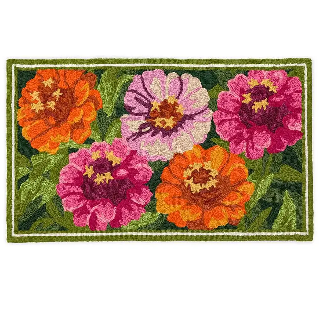 Our Indoor/Outdoor Zinnia Accent Rug has hand-hooked detailing that's full of texture and color. Ready to greet the season and visitors, this rug's charming design and vibrant colors bring a fresh look to your home. Made of 100% polypropylene, this decorative rug is durable enough to use indoors and out. It's guaranteed to add instant style to your front door, porch, mudroom or kitchen. Polypropylene rug is easy-care: vacuum, spot clean or hose down, then air dry completely. Imported.