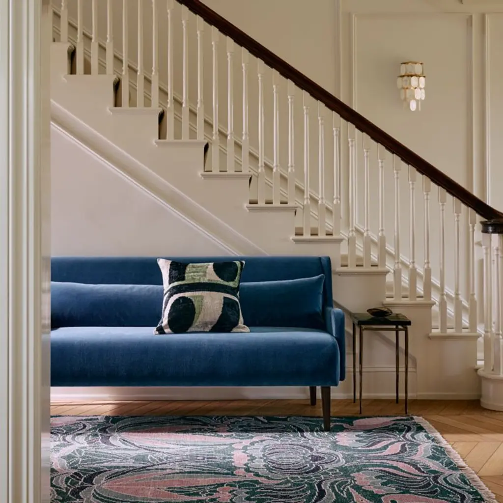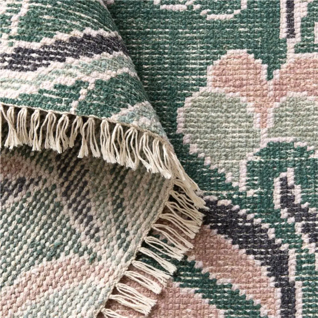 Hand-knotted wool rug by House of Heras is designed to be collected, not just placed. Opulent florals and graceful cranes unfold across a rich green ground, their forms both intricate and ethereal. Finished with fringe along the short edges, rug balances decorative detail with a grounded sense of craftsmanship, evoking the beauty of a vintage textile softened by time with a flat, zero-pile surface and hand-distressed finish. CB2 exclusive.How will it look in your room? 12"x12" rug samples are available in stores for a fee refundable upon return of the sample.