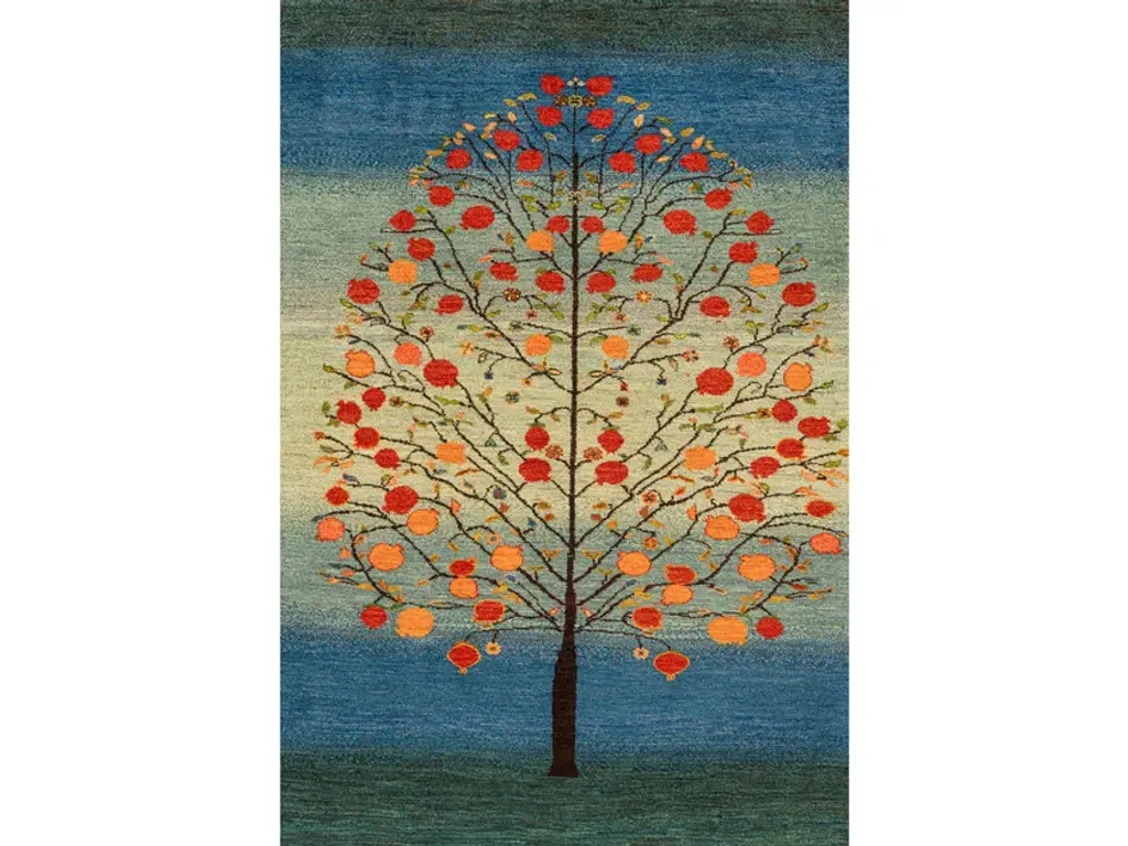 Pomegranate Tree of Life 11 is a rectangular wool rug.Zollanvari Super Fine Gabbeh.Trees, flowers and animals (principally lions) are design themes that are used by tribal women to weave some of Zollanvari’s most original Gabbehs. The weavers are given patterns and colour ranges (often inspired by ancient and archaic patterns such as the ‘Tree of Life’) but have a free hand in producing these works of woven art using their imaginations and the traditional design vocabulary passed down through each new generation of weavers. This makes each Gabbeh unique and individual. Flora & Fauna design Gabbehs are also available in Zollanvari Super Fine (Kashkuli, Luribaft and Bulurbaft) and Zollanvari Fine qualities.The designs are available in custom and bespoke sizes and colours.
