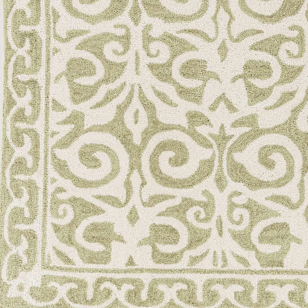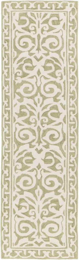 Collection: Pontefract Colors: Olive, Peach Construction: Hand Hooked Material: 100% Polyester Pile: Medium Pile Pile Height: 0.22" Styles: Transitional Backing: Canvas Made In: China Thickness: 0.22" Price Range: $$$$$ (Affordable)
