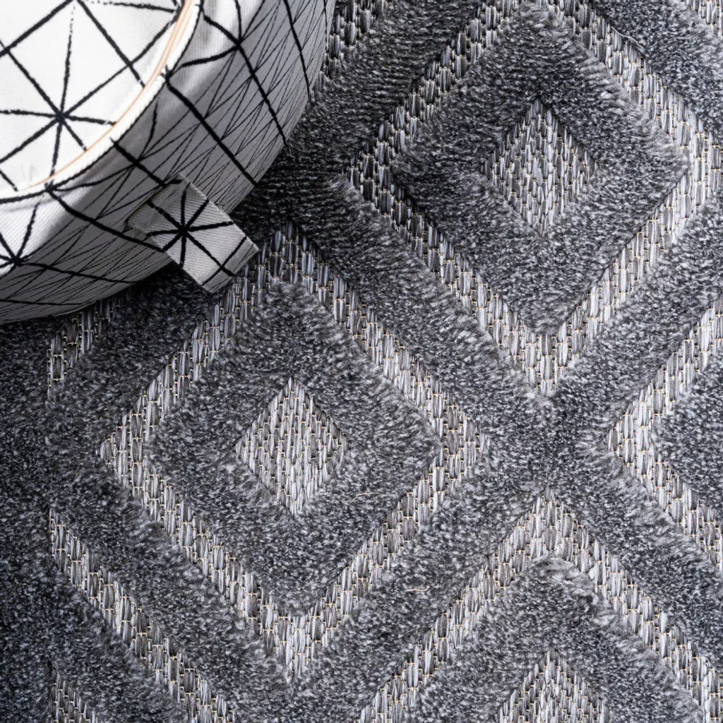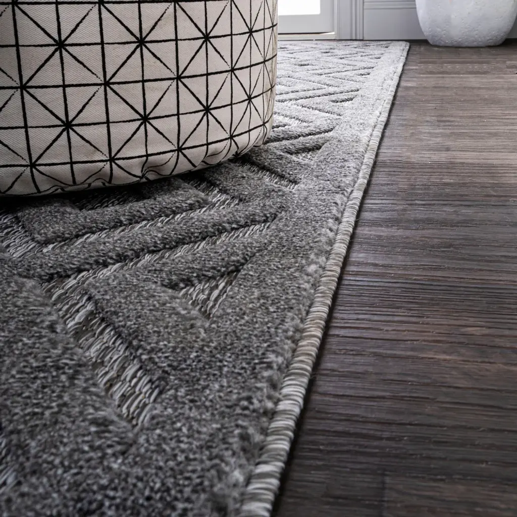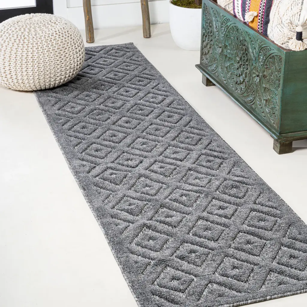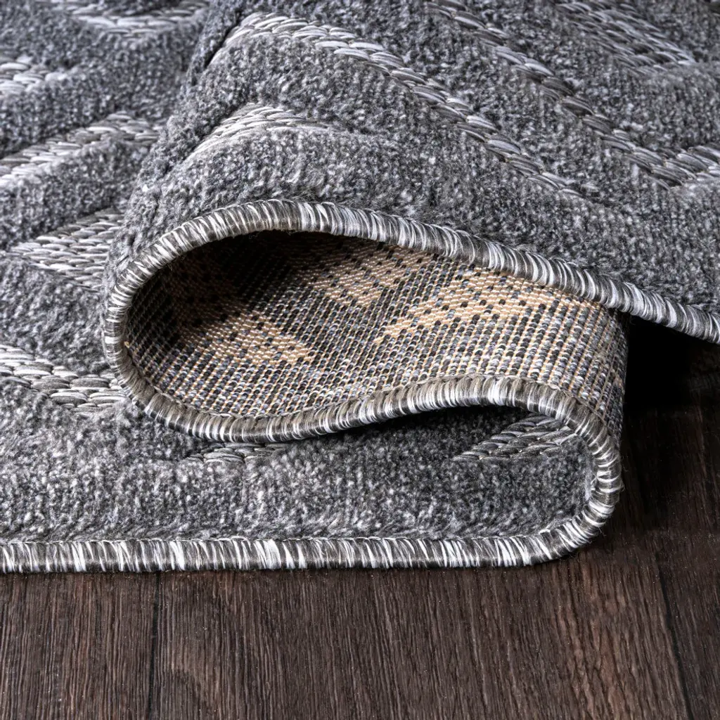 Inspired by traditional Mediterranean tile floors, this neutral indoor/outdoor rug adds subtle, elegant pattern to your porch, patio or sunroom. Mingled gray threads give the geometric pattern a vintage feel that''s perfect for an entry, kitchen, hallway, living room or bedroom. The pet-friendly and kid-proof low pile design makes it easy to clean, and perfect for the modern beach house.Features:• Power loomed in a low pile that''s soft and durable, with a latex backing for added stability• Woven in shades of gray with mingled threads for a handmade effect• Made from easy-care polypropylene - just sweep, vacuum or hose down with mild soap and water• 100% Polypropylene• No backing, use of rug pad is recommended (sold separately)• Power Loomed in Turkey• Actual Dimension: 2 ft. 2 in. x 8 ft.• Color: Dark Gray• Thickness measures: 0.43 in.• Available in multiple sizes and/or colorsRug Care:• Vacuum regularly and spot clean as needed; avoid direct and continuous exposure to sunlight; use brushless vacuum; remove spills immediately; if liquid, blot with clean, undyed cloth by pressing firmly around the spill to absorb as much as possible; for hard to remove stains, professional rug cleaning is recommended; store in a dry, well ventilated area and rotate for consistent wear• Packing and shipping may cause temporary creases in rugs, which will flatten out after a week on the floor; to expedite the process, try back-rolling your rug before laying it down, and then allow ample time for the remaining creases to relax• Please Note: Due to differences in monitors, some rug colors may vary slightly. Lengths and widths may vary from the published dimensions. Patterns may vary slightly according to shape and size selected.