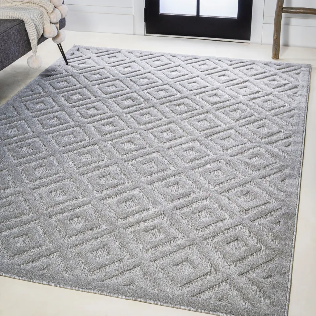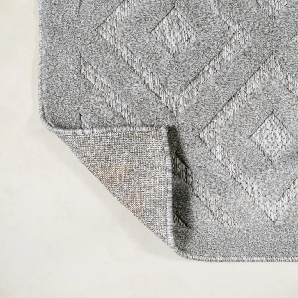 Inspired by traditional Mediterranean tile floors, this neutral indoor/outdoor rug adds subtle, elegant pattern to your porch, patio or sunroom. Mingled gray threads give the geometric pattern a vintage feel that''s perfect for an entry, kitchen, hallway, living room or bedroom. The pet-friendly and kid-proof low pile design makes it easy to clean, and perfect for the modern beach house.Features:• Power loomed in a low pile that''s soft and durable, with a latex backing for added stability• Woven in shades of gray with mingled threads for a handmade effect• Made from easy-care polypropylene - just sweep, vacuum or hose down with mild soap and water• 100% Polypropylene• No backing, use of rug pad is recommended (sold separately)• Power Loomed in Turkey• Actual Dimension: 5 ft. 3 in. x 7 ft. 7 in.• Color: Light Gray• Thickness measures: 0.43 in.• Available in multiple sizes and/or colorsRug Care:• Vacuum regularly and spot clean as needed; avoid direct and continuous exposure to sunlight; use brushless vacuum; remove spills immediately; if liquid, blot with clean, undyed cloth by pressing firmly around the spill to absorb as much as possible; for hard to remove stains, professional rug cleaning is recommended; store in a dry, well ventilated area and rotate for consistent wear• Packing and shipping may cause temporary creases in rugs, which will flatten out after a week on the floor; to expedite the process, try back-rolling your rug before laying it down, and then allow ample time for the remaining creases to relax• Please Note: Due to differences in monitors, some rug colors may vary slightly. Lengths and widths may vary from the published dimensions. Patterns may vary slightly according to shape and size selected.