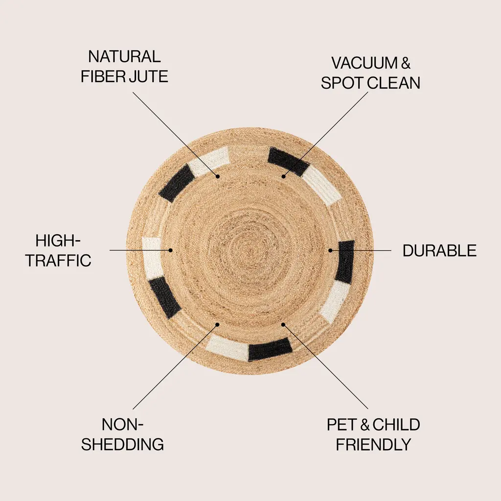 Add modern Bohemian style to your living room, bedroom, or home office with our flat-weave jute circle rug. Handmade by skilled artisans, this casual rug has a chic geometric border design. Versatile, easy-care natural fibers are the perfect neutral flooring for minimalist or modern cottage interiors.