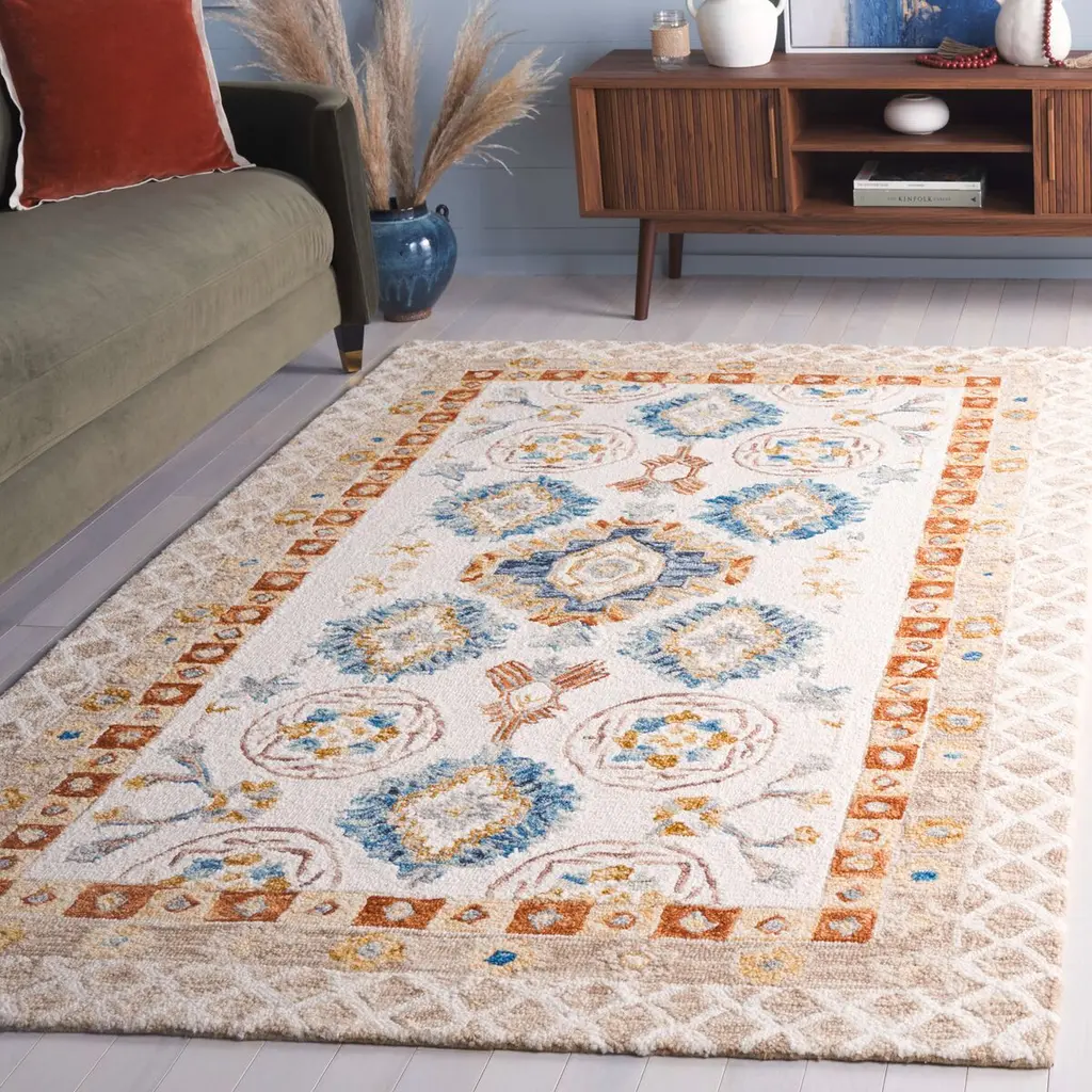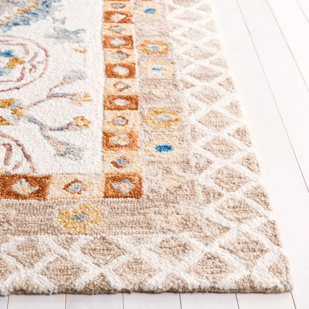 Introducing our exquisite hand-tufted area rug, a perfect blend of timeless style and luxurious comfort for your home. Crafted with precision in India, this small rectangle rug measures 4 feet by 6 feet and features a plush 3/8 inch pile height that invites you to step on and experience the softness underfoot. This area rug showcases an elegant ivory and beige color palette that creates a serene and inviting atmosphere in any room. The intricate rug pattern displayed in the image captures a harmonious mix of traditional motifs, which include symmetrical floral designs and ornate geometric shapes, alongside a sophisticated border that adds a definitive edge to the aesthetic. Made from a superior blend of 80% wool and 20% cotton, this rug promises both warmth and durability, making it an ideal choice for areas with high foot traffic. The hand-tufted construction not only ensures a dense and thick pile but also lends the rug a hand-crafted look that's rich in detail and full of character. Transform your living space with this stunning rug that effortlessly combines old-world charm with modern craftsmanship to bring beauty and elegance to your floors.