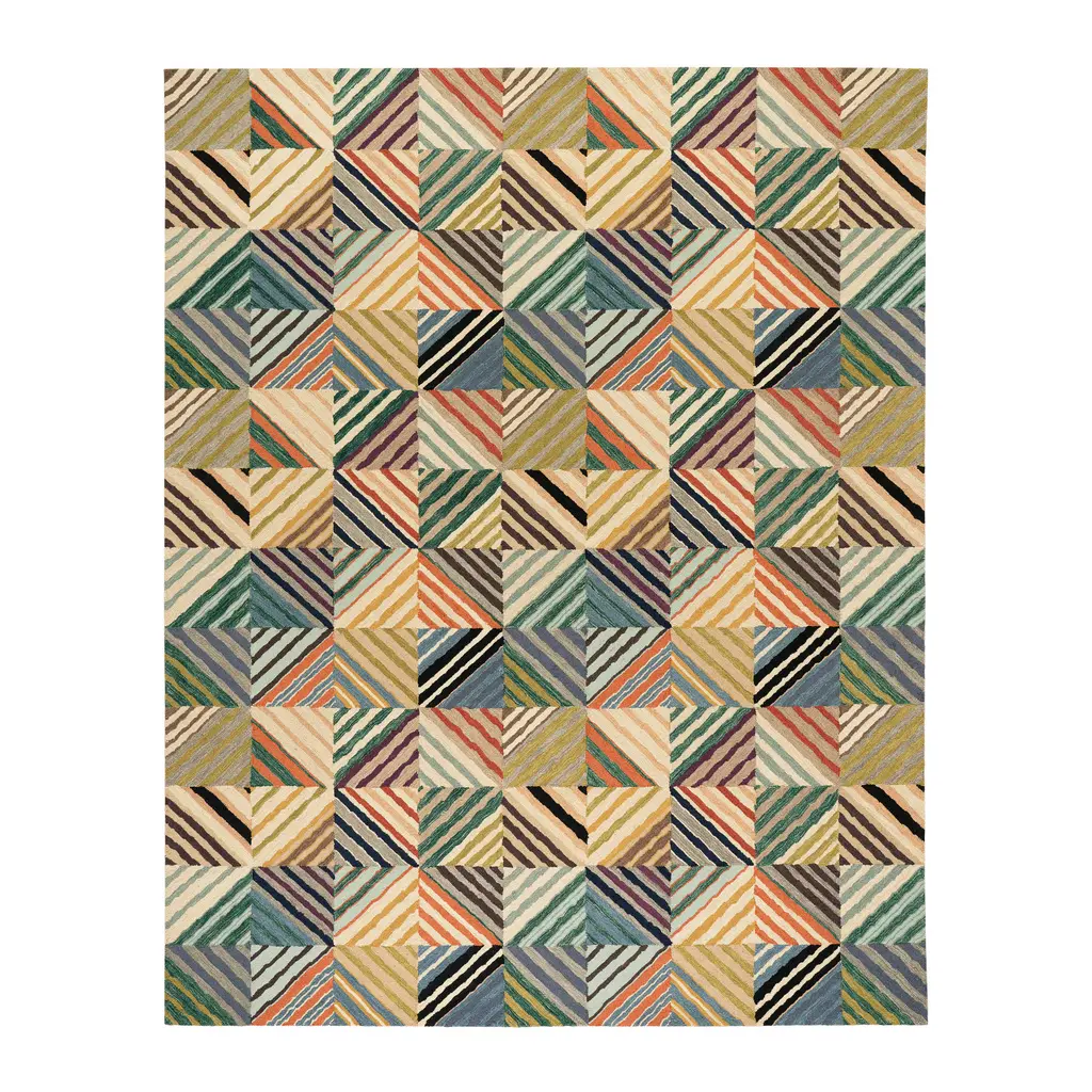 Add color to any space with this durable, one-of-a-kind rug, expertly handcrafted from 100% wool. Inspired by a hand-painted artwork from Europe, its medley of muted hues, patchwork squares, and ticking stripes is simply beguiling.