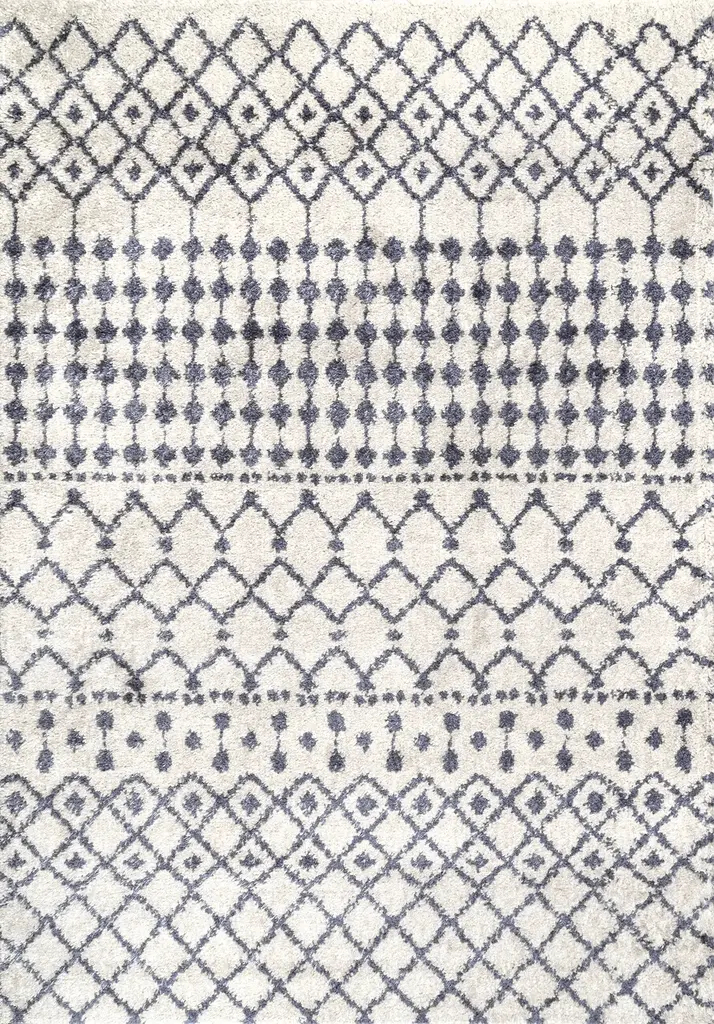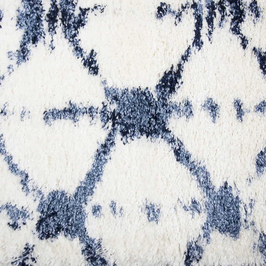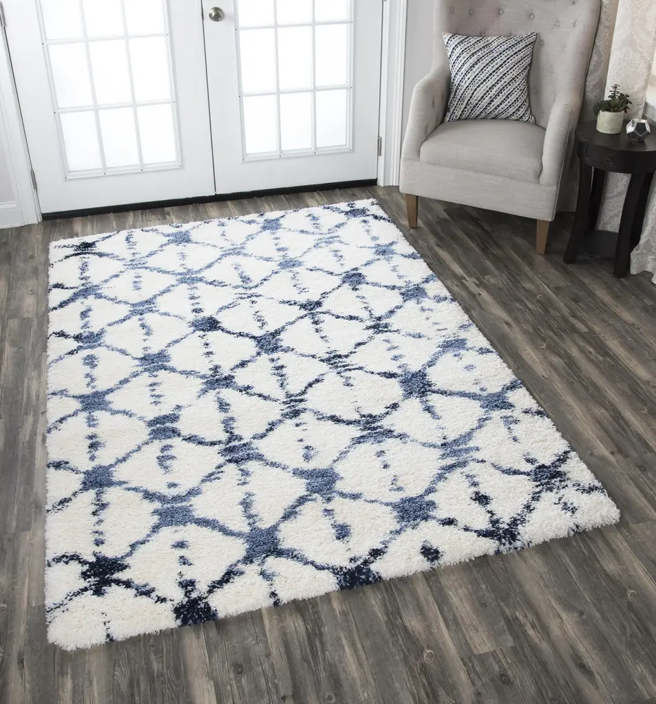 Transform any decor with the look of this tribal inspired Modern design. Multi-toned, for easy decorating, in a pure Ivory background with light and dark Blue twisted yarn accents. Constructed of non-shedding, enhanced polypropylene yarn, this ultra-plush shag is easy to care for, yet so resilient it can be used in high traffic areas. This rug is the perfect combination of style, comfort and durability!