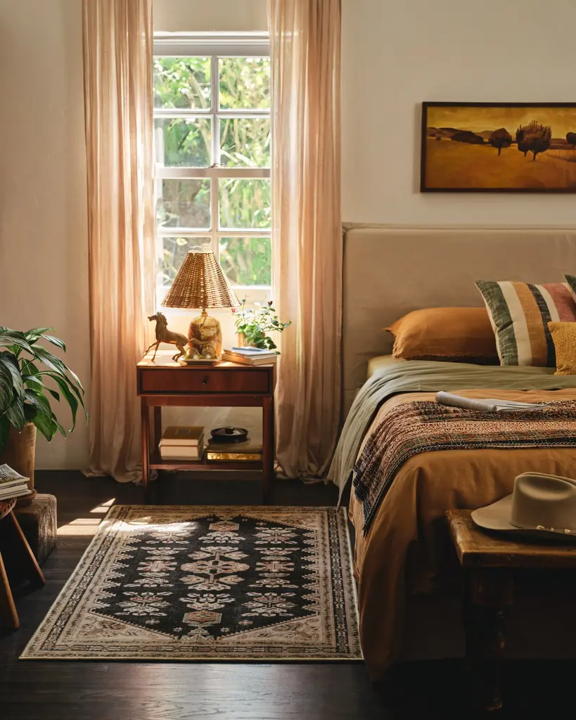 Behold the bold yet understated Pradera Tan & Soft Black Rug. Inspired by antique Persian rugs from the Zagros Mountains, this rug features geometric floral motif panels that echo the interpretation of the natural world—managing to blend in and stand out at the same time with a warm, neutral palette. Water-resistant, stain-resistant, and machine-washable. Colors may vary by device and lighting.
