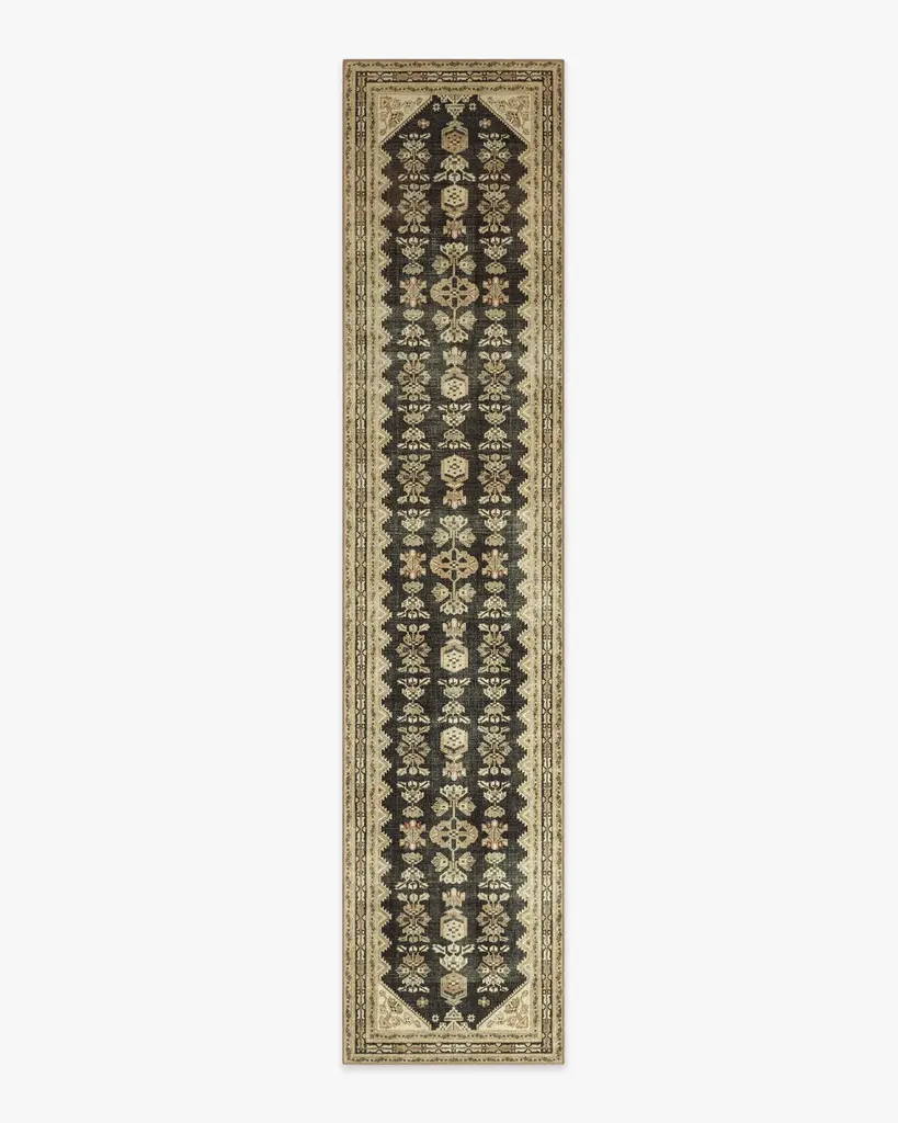 Behold the bold yet understated Pradera Tan & Soft Black Rug. Inspired by antique Persian rugs from the Zagros Mountains, this rug features geometric floral motif panels that echo the interpretation of the natural world—managing to blend in and stand out at the same time with a warm, neutral palette. Water-resistant, stain-resistant, and machine-washable. Colors may vary by device and lighting.