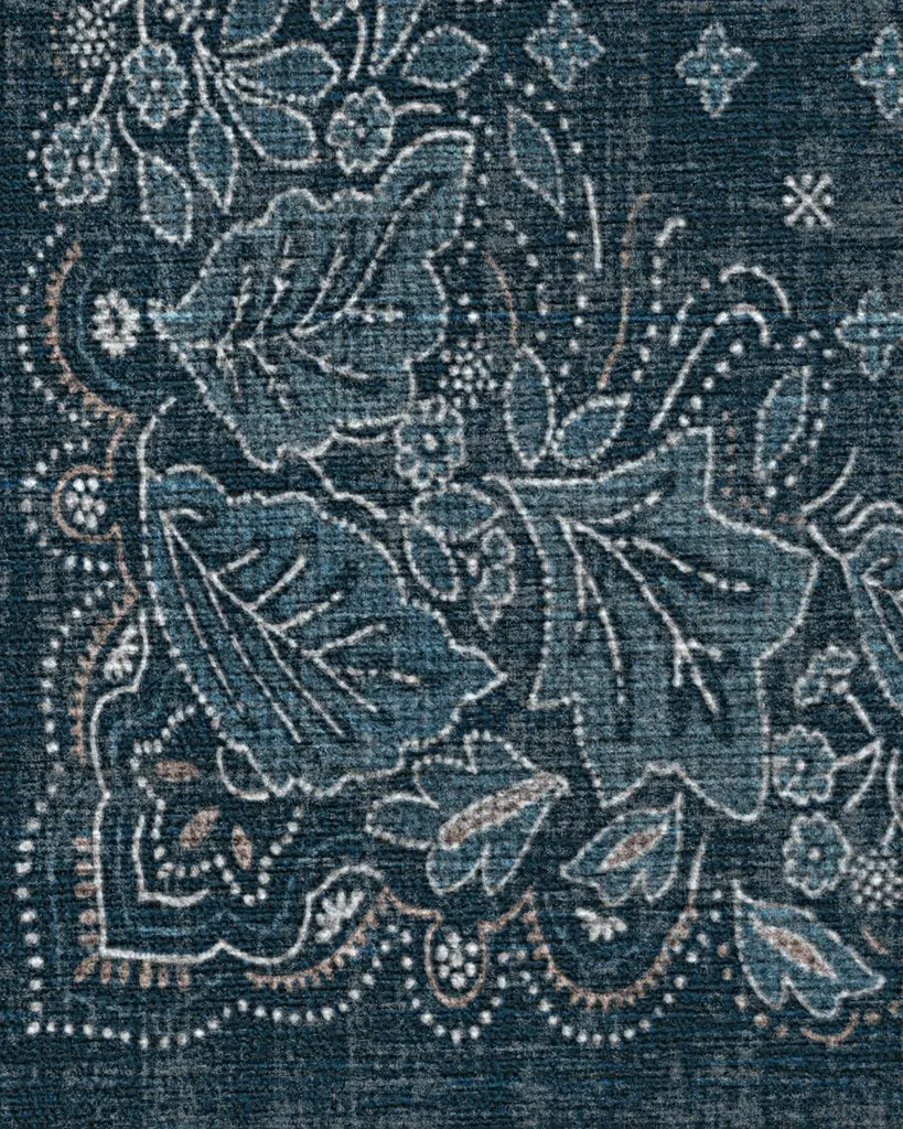 Inspired by vintage bandana designs, our Prato Midnight Blue Rug features leaf-like motifs set around the border with delicately dotted outlines, enhancing the bandana-inspired aesthetic. Pops of cream and neutral tones create a beautiful design against a midnight blue background. Water-resistant, stain-resistant, and machine-washable. Rug colors may vary slightly according to your device and the lighting in your space.