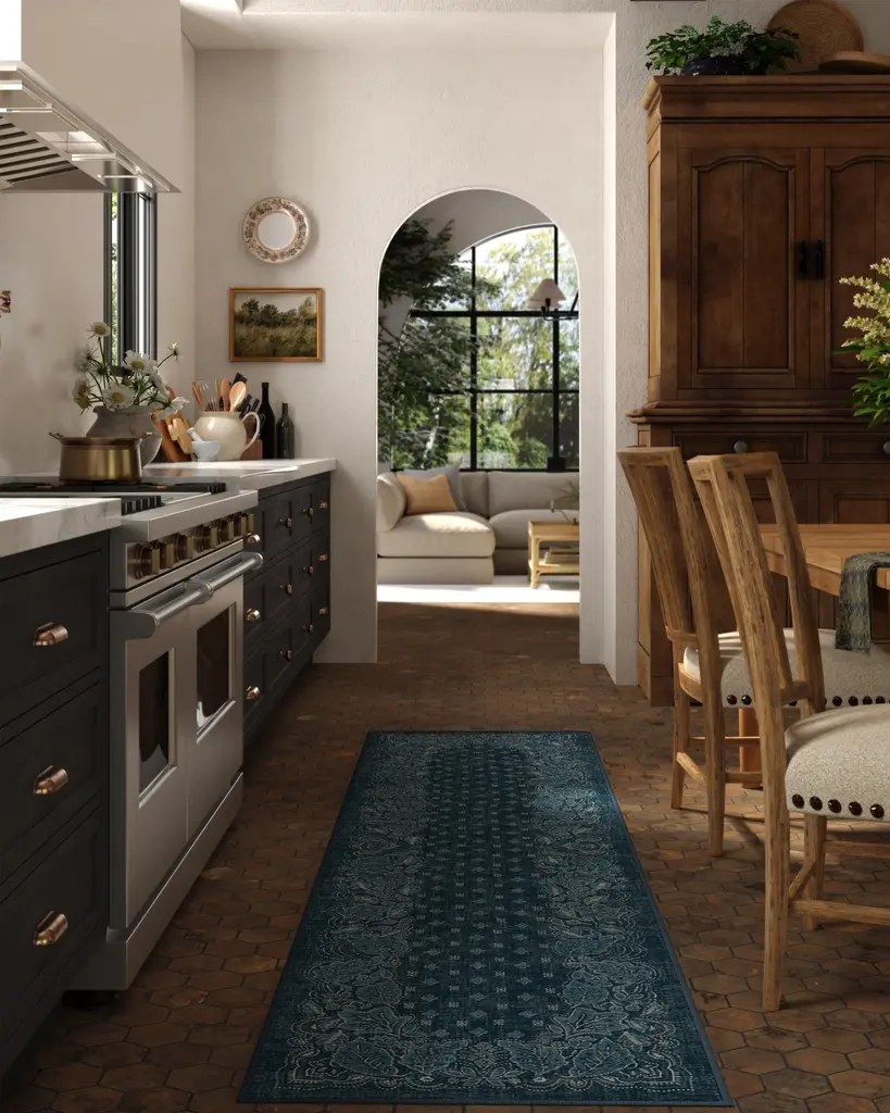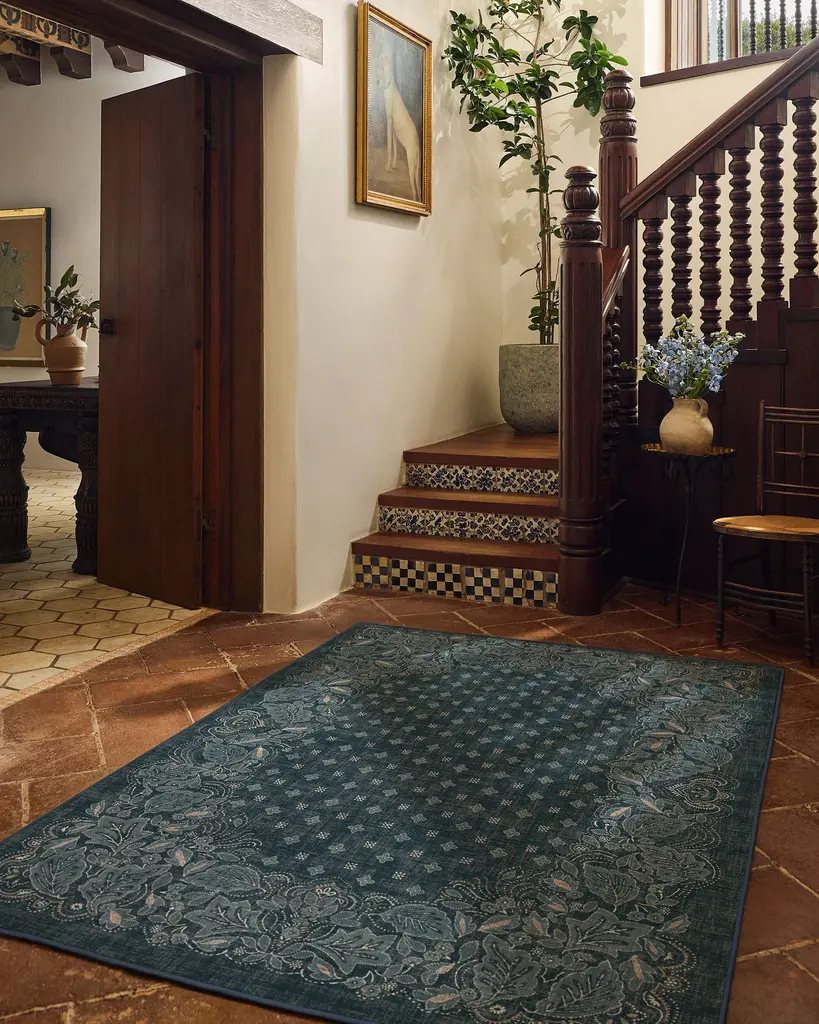 Inspired by vintage bandana designs, our Prato Midnight Blue Rug features leaf-like motifs set around the border with delicately dotted outlines, enhancing the bandana-inspired aesthetic. Pops of cream and neutral tones create a beautiful design against a midnight blue background. Water-resistant, stain-resistant, and machine-washable. Rug colors may vary slightly according to your device and the lighting in your space.
