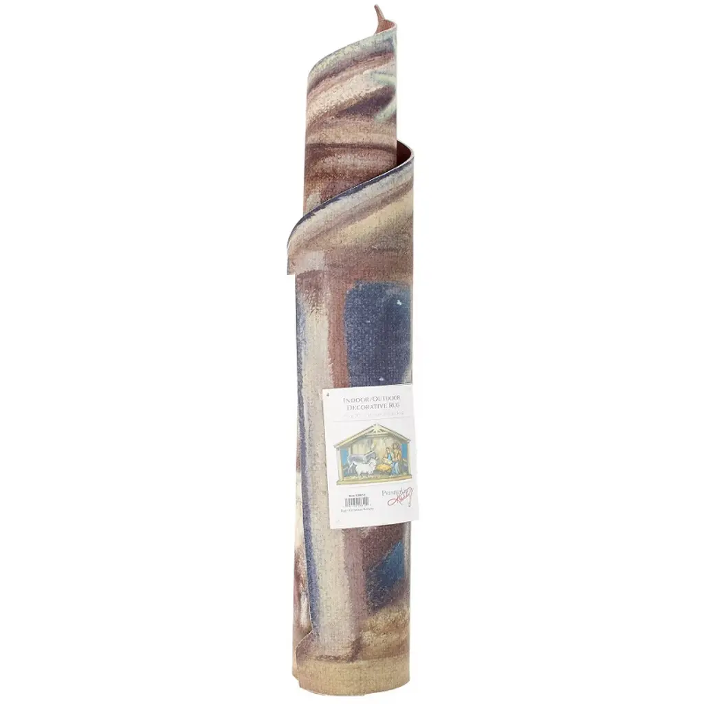 A polyester rug from our Christmas Collection cut in the shape of the displayed nativity scene. Nativity design is replicated from original artwork painted onto burlap canvas, giving the art a unique depth and texture. Seasonal rug can be used indoors or outdoors and features skid-resistant backing to help stay in place. Spot cleaning recommended. Our Christmas Nativity rug comes packaged neatly rolled with a tag displaying the full rug design. A nativity-themed Christmas home accent that adds functional style.