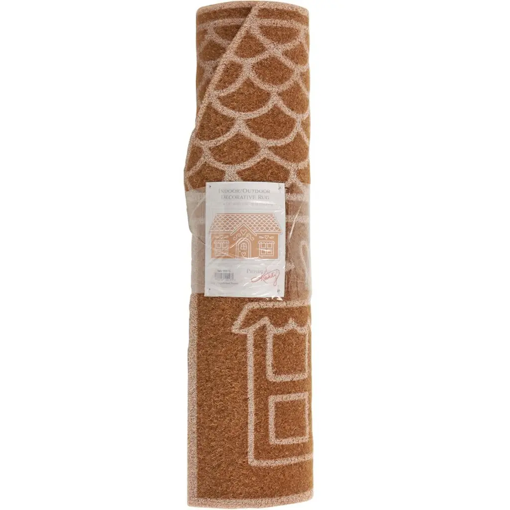 A durable faux coir rug from our Christmas Collection in the shape of the displayed gingerbread house design. Faux coir offers the benefit of not shedding over time, unlike natural coir rugs, so the integrity of the design and colors will last longer. The rug can be used indoors or outdoors and features a skid-resistant backing to help stay in place. Spot cleaning is recommended. Our Gingerbread House rug comes packaged neatly rolled with a tag displaying a full rug design. A gingerbread-themed home accent that adds functional seasonal style.