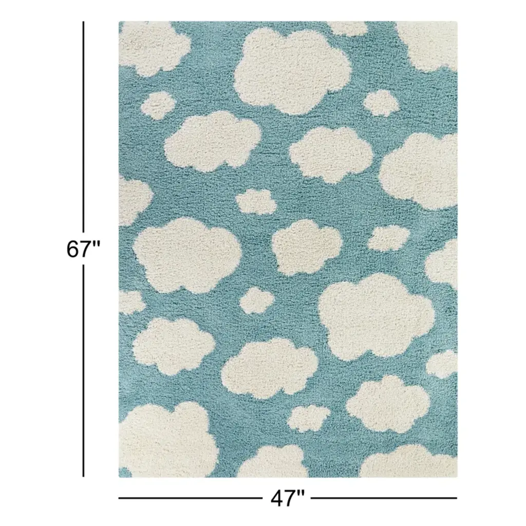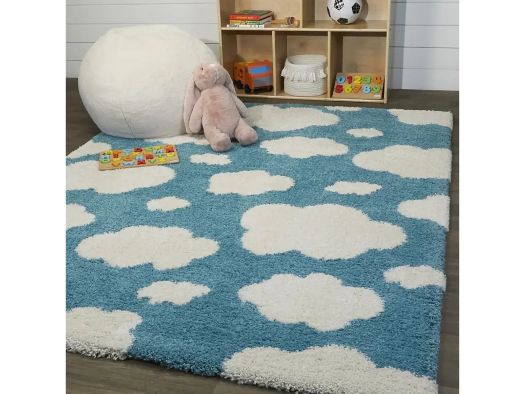 Bring playful style and an optimistic outlook to your child's bedroom, playroom, or nursery with this fun area rug. Power-loomed using 100% polypropylene, this rug is made in a shag flokati style with stain-resistant materials and a jute and polyester backing. The pattern features a whimsical pattern of fluffy clouds over an all-over background – bringing the best of sunny days outdoors inside to be enjoyed all year round. We love that this rug's high 1.18'' pile height provides a cushioned surface for your kids to play or take their first steps on. When it needs a refresh, just vacuum or spot-clean it.