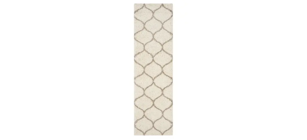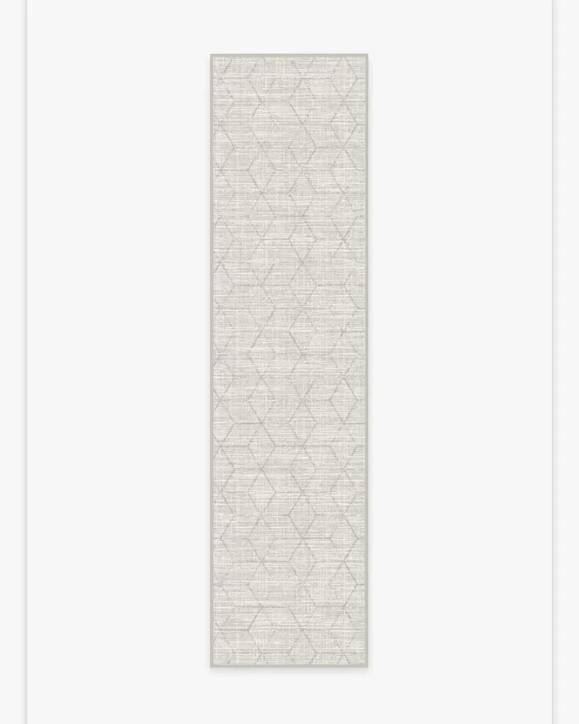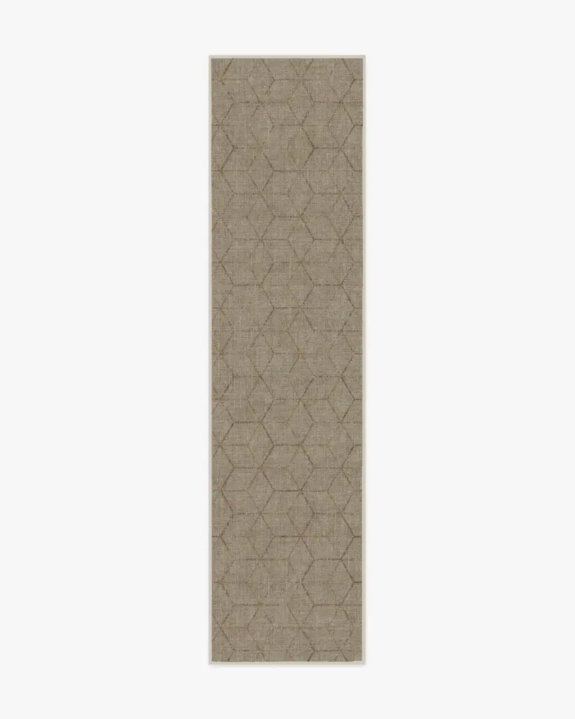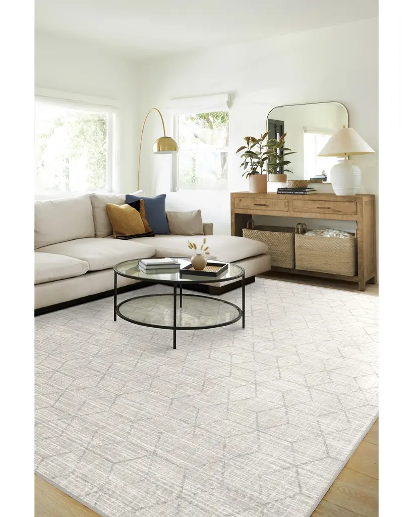 A subtle, geometric design. Our Prisma Monochrome Rug features an overlapping hexagonal motif on a neutral cream background. Water-resistant, stain-resistant, and machine-washable.