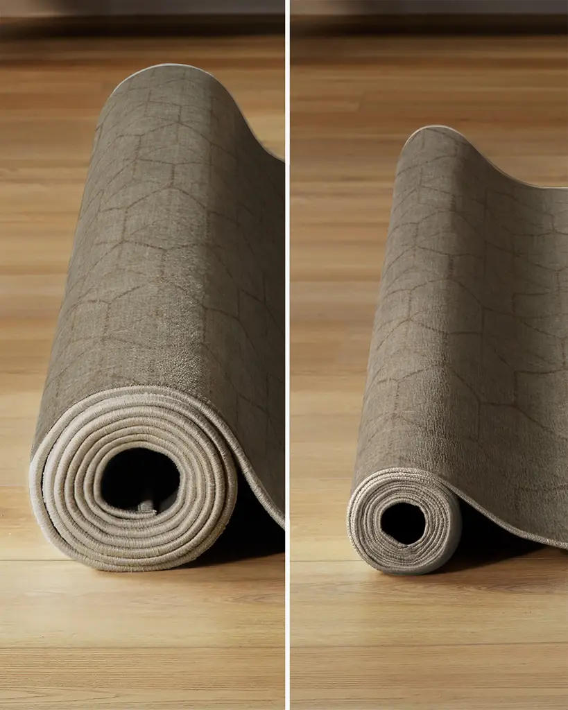 Give a warm welcome to the Prisma Natural Stone Rug, a subtle, geometric composition with contemporary style. This textural design features an overlapping hexagonal motif on a natural stone background, with mushroom taupe accents. Water-resistant, stain-resistant, and machine-washable. Rug colors may vary slightly according to your device and the lighting in your space.