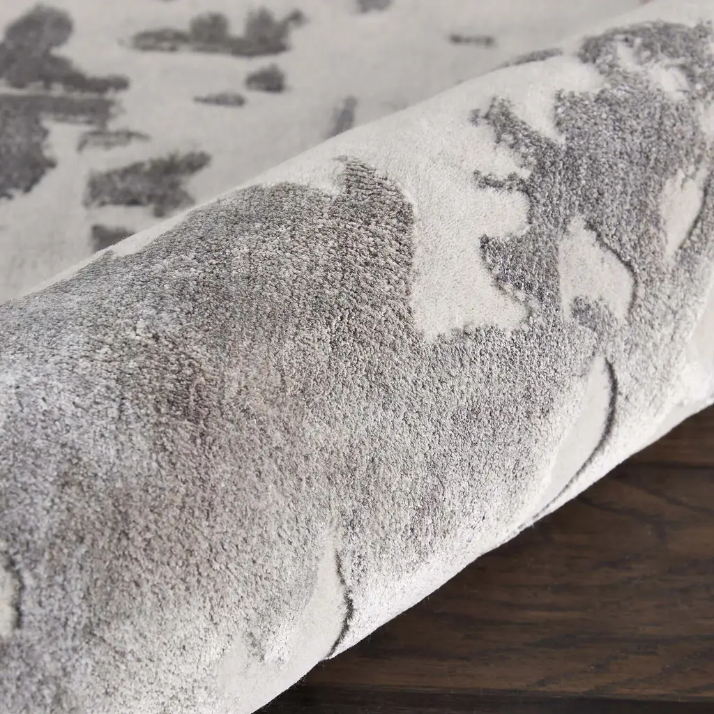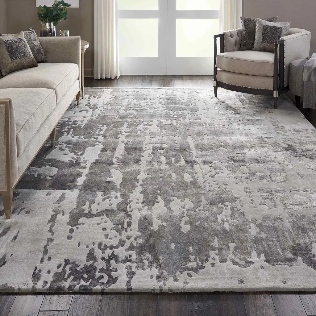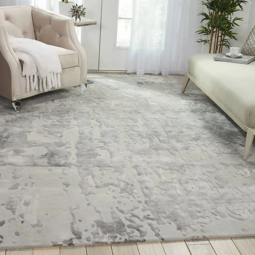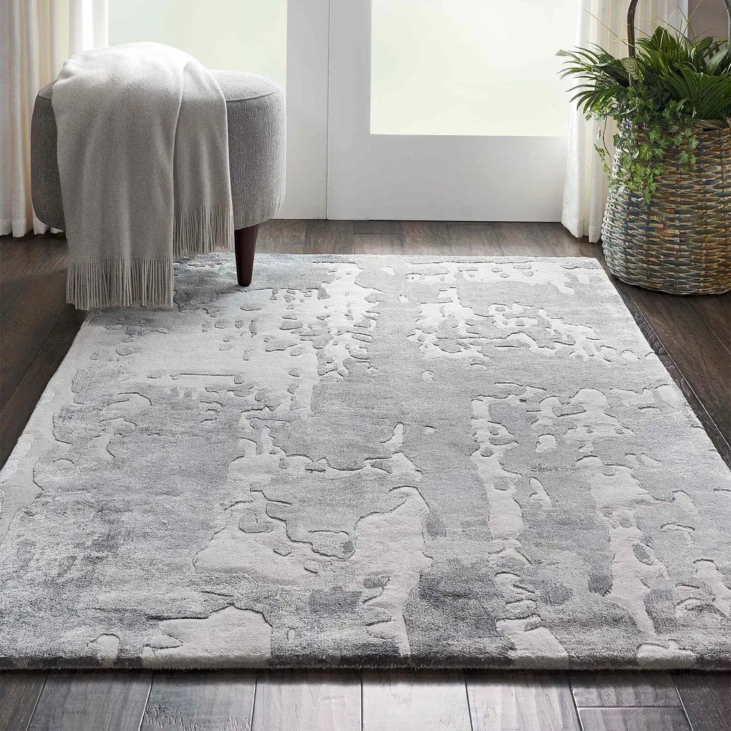 This amazingly artistic rug could adorn a wall as easily as a floor! Elegant silver and grey tones flow in simulated brush strokes that make a stunning design statement. This hand-tufted rug features a thick, luxurious pile, carved for added dimension and texture for the perfect combination of durability, comfort, and artistic appeal.Designed to captivate, the Prismatic Collection from Nourison brings charismatic color and daringly dimensional texture to the modern home. Expertly hand-tufted from the finest New Zealand wool interwoven with silk-like Luxcelle™, these contemporary rugs blend distinctive style and lasting comfort exquisitely. Ships In 7-10 Business Days Ships In 7-10 Business Days Ships In 7-10 Business Days Ships In 7-10 Business Days Ships In 7-10 Business Days Rug pad recommended Dense, durable pile Carved details Contemporary abstract pattern Excellent durability even under heavy foot traffic Due to the detailed construction of our rugs, both handmade and machine-made, sizes may vary. Slight variations in color from product to product are natural characteristics of high quality handcrafted home decor. Your product may not exactly match what is pictured on this page.