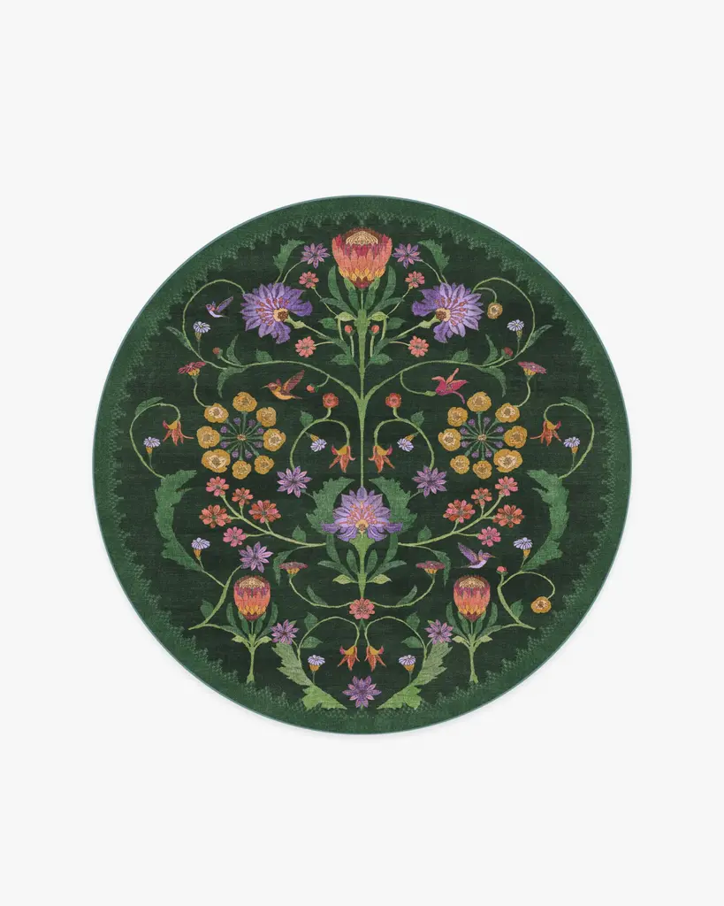 BACK BY POPULAR DEMAND: Celebrate a lasting legacy with our Limited Edition Iris Apfel Protea Forest Green Rug. Inspired by floral fabrics from Iris' own collection, this botanical design features vivid, mirrored floral motifs that attract the sweetest hummingbirds in a garden-like setting. Petals in bright yellow, lavender, pink, and red bloom beautifully against a deep green background. Water-resistant, stain-resistant, and machine-washable. Rug colors may vary slightly according to your device and the lighting in your space.