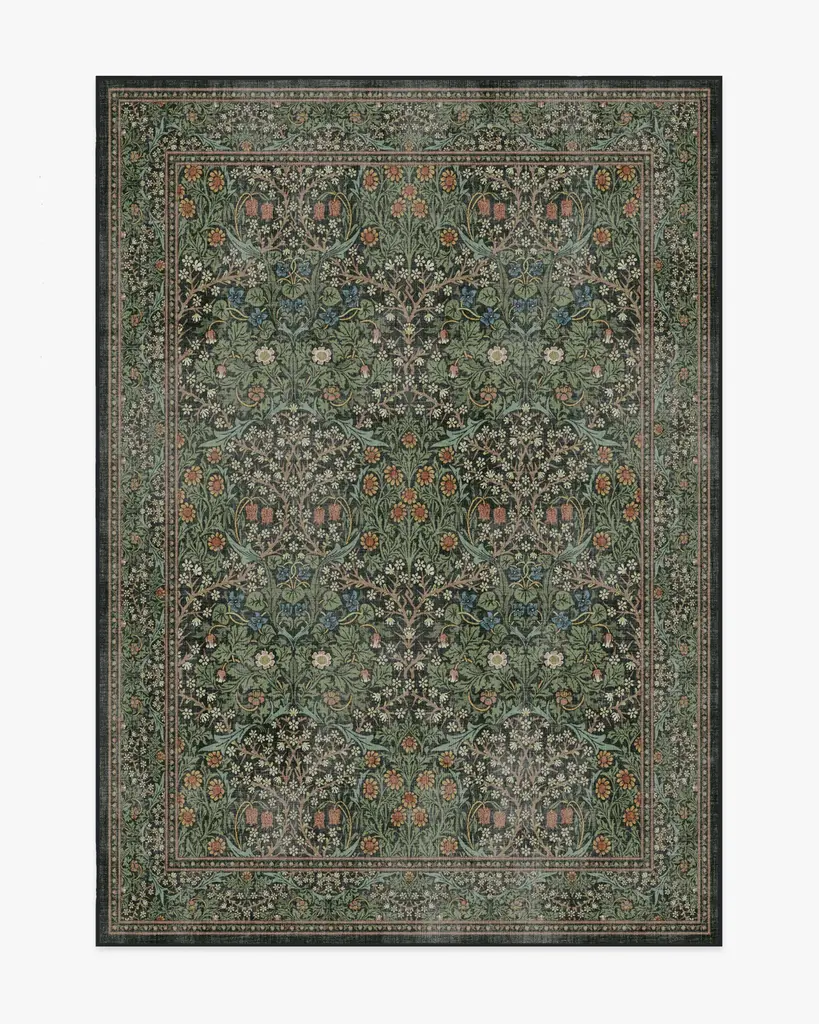 BACK BY POPULAR DEMAND: Celebrate a lasting legacy with our Limited Edition Iris Apfel Protea Forest Green Rug. Inspired by floral fabrics from Iris' own collection, this botanical design features vivid, mirrored floral motifs that attract the sweetest hummingbirds in a garden-like setting. Petals in bright yellow, lavender, pink, and red bloom beautifully against a deep green background. Water-resistant, stain-resistant, and machine-washable. Rug colors may vary slightly according to your device and the lighting in your space.