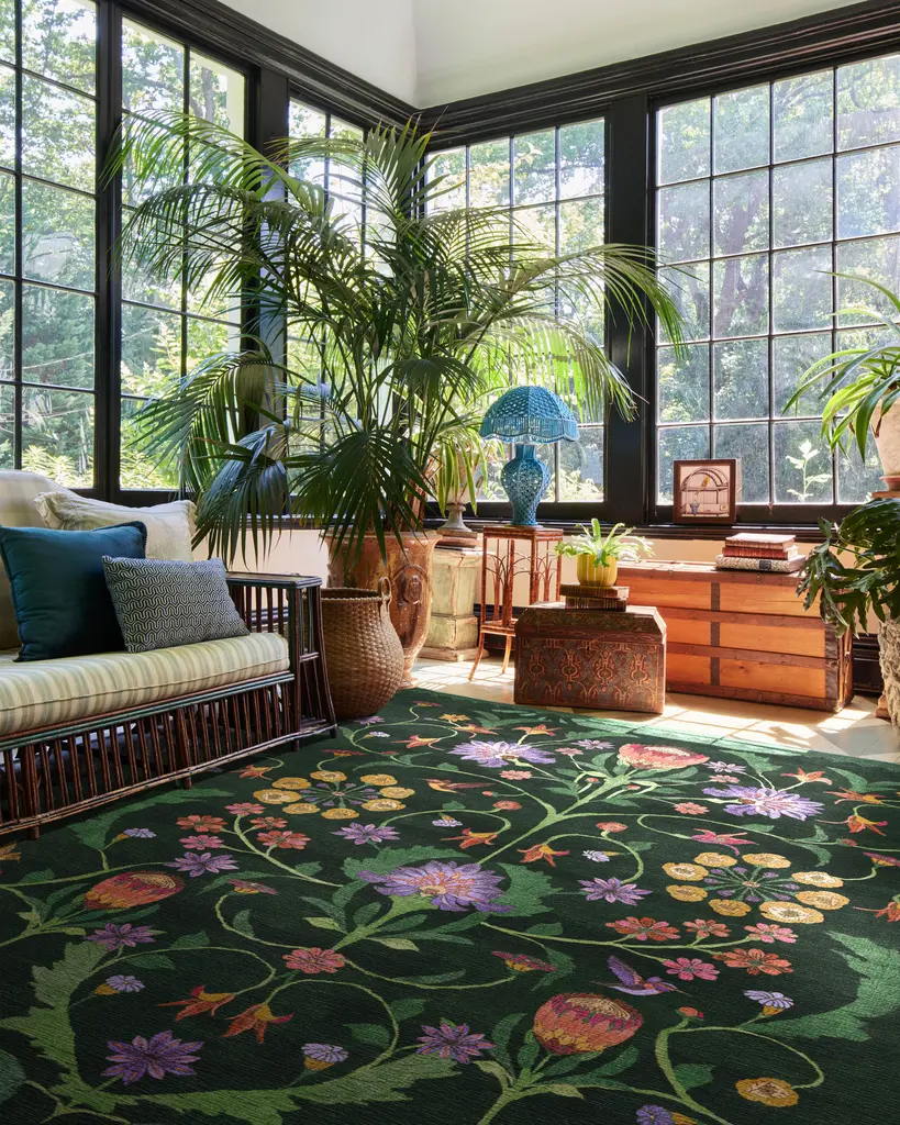 BACK BY POPULAR DEMAND: Celebrate a lasting legacy with our Limited Edition Iris Apfel Protea Forest Green Rug. Inspired by floral fabrics from Iris' own collection, this botanical design features vivid, mirrored floral motifs that attract the sweetest hummingbirds in a garden-like setting. Petals in bright yellow, lavender, pink, and red bloom beautifully against a deep green background. Water-resistant, stain-resistant, and machine-washable. Rug colors may vary slightly according to your device and the lighting in your space.